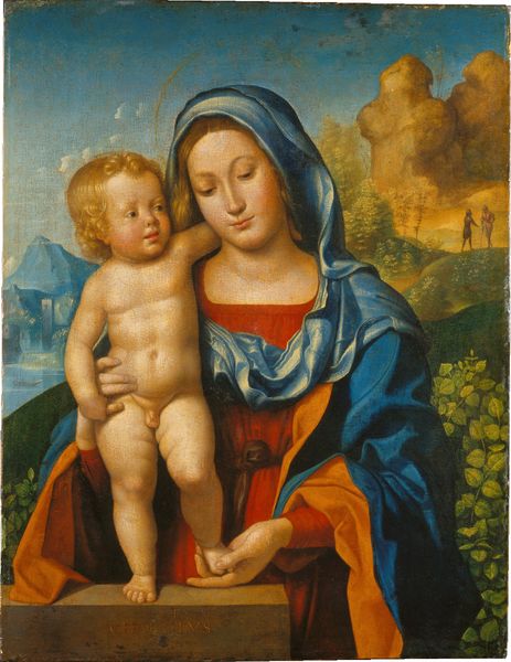 Editor: Gerard David’s "The Rest on the Flight into Egypt," painted around 1515 and currently housed at The Met, really strikes me with its sense of serene stillness. Mary, in her voluminous cloak, feels monumental against the detailed landscape. What secrets do you think lie within this tranquil scene? Curator: Ah, a chance encounter with tranquility! But is it truly that simple, that straightforward? Consider the setting: They're fleeing. The quiet, you see, is more like a hushed breath amidst chaos. This particular rendering, mind you, deviates from the popular compositions where Joseph is close. Where *is* Joseph, I wonder? Are those figures on the path in the back representing their journey or the pursuit they are avoiding? What do you think? Editor: That's a fascinating point, framing it as a fleeting moment of respite. The figures on the path do add an element of tension, then. I had not even noticed them until you pointed them out! Curator: It makes you wonder, doesn’t it, about what the landscape itself signifies. Perhaps it echoes Mary's own state – seemingly still, yet inwardly bracing for what’s to come. And do not miss the plants around her, as they also carry their symbolic weight... Editor: So, beneath the surface of peaceful beauty, we have a potent blend of hope, anxiety, and hidden symbols. Thank you. Curator: Exactly! Next time you stumble upon serenity in art, poke it a little. You might find a thrilling unrest, a captivating tension lurking just beneath the surface, wouldn't that be something?