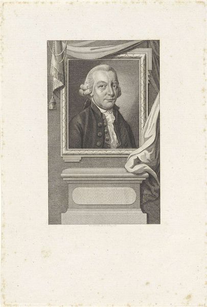 Editor: So, this is Reinier Vinkeles’ "Portret van Joannes Florentius Martinet" from 1778, an engraving. It has an incredible amount of detail for a print. I'm really struck by how lifelike the subject appears given the constraints of the medium. What can you tell me about it? Curator: Let’s think about this engraving in terms of its production and reception. The subject, Martinet, was a prominent figure, so the print served a specific function: to disseminate his image to a wider public. We have to consider who had access to such prints, and how the material reality of printmaking – the cost of paper, the engraver’s labor – shaped that access. Editor: That makes sense. So, it’s not just about aesthetics, but about how images circulated in society and who controlled that circulation. Curator: Exactly. Consider the engraver's skill—how was that labor valued? And what does the choice of engraving as a medium, rather than painting, tell us about the intended audience and the work’s social function? Think about the economic accessibility of a print compared to an oil painting, and who could afford either. Editor: Right. A print allows for multiple reproductions. Was it common for artists to produce their portraits in printed versions? Curator: It was a common and practical way to build and spread your brand beyond those who commissioned your work. Looking at the tools that the engraver used to produce this work tells us that it served not only a material purpose but a commercial one as well. Editor: It’s fascinating to think about how this print functioned almost as a form of early mass media. I never really considered it like that before, now that you pointed out, these images became tools. Curator: Precisely. By considering the materiality of this print and its conditions of production, we gain a deeper understanding of its social and historical significance. We get beyond just thinking about aesthetics to consider social context, as you mentioned, that brings a fresh perspective on it.