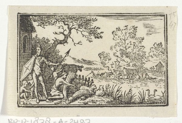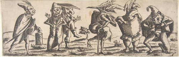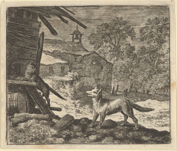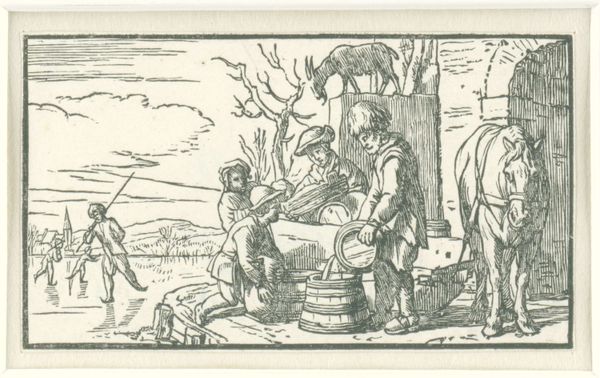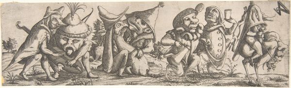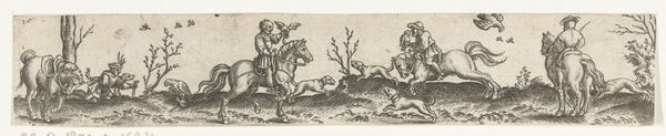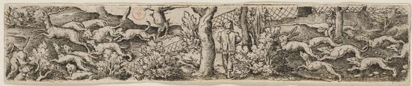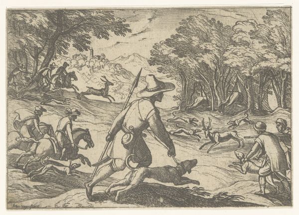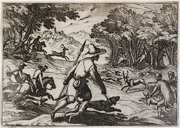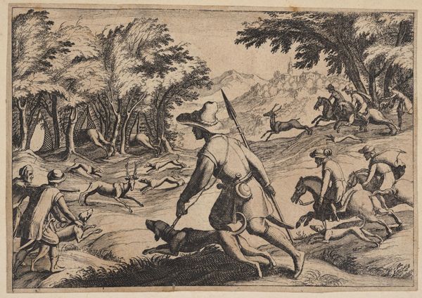 Curator: This etching and engraving by Abraham de Bruyn from 1565, titled "Hertenjacht," depicts a deer hunt. It's currently housed at the Rijksmuseum. The first thing I notice is the incredible energy captured in such a small, finely worked print. The frenetic movement of the dogs, the hunters in pursuit... it really comes alive. Editor: It’s grim. The image itself presents a violent display, but what kind of labour went into its construction? It’s fascinating to consider the physical process of creating such detail with engraving and etching tools. What kind of training did de Bruyn undergo to render so vividly that violence into existence with such care? Curator: Absolutely. And to broaden that idea, consider the sociopolitical backdrop. Hunting in the 16th century was often the purview of the aristocracy; examining this print gives insight into not just a leisure activity but also a marker of class and privilege at that time. Did this also reflect attitudes of colonialism when engaging in hunting as violence? Editor: Precisely. These images can become commodities traded globally across different societal echelons. It's also critical to delve into the pigments used, their sourcing, and their societal value as materials; or about the labor it involved to make such an edition run. These things contribute meaning beyond just the surface of the print. Curator: Looking closer, I see an inherent tension. There's the overt depiction of the hunt, of course, but there’s also a deliberate crafting of an idyllic landscape. I wonder if that juxtaposition subtly speaks to the social and environmental impact these hunting expeditions had, masking perhaps a deeper concern beneath a veneer of idealized country life? The violence isn't just towards the animals. Editor: It’s tempting to focus only on aesthetics or allegories, but we risk overlooking that the labour involved to extract the copper from a mine. Then you prepare and polish the plate, which takes both time and a degree of manual skill. And then that metal is etched away to render it chemically. How does the cost in both natural and human terms reflect back on how society consumes art like this? Curator: I agree that that’s necessary to discuss. It urges us to re-evaluate traditional boundaries and challenge us to reconsider our relationships with the materials and making involved, to understand their values historically but more crucially, contemporarily, if we can even access those realities truthfully. Editor: It does push us to scrutinize all dimensions and layers to expose their societal links and economic impacts on today’s modern sensibilities.