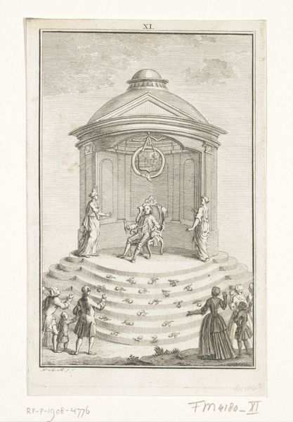 Curator: Looking at this print, it's all so meticulously rendered, but I feel a slight chill. Perhaps it’s the formal garden, or that rather stern figure next to what looks like a pump combined with a sundial. What does it conjure up for you? Editor: Well, my first impression is that of a carefully constructed performance, a scene frozen in time. The pump, the sundial… they seem like props in a theatrical production, speaking to themes of time and the manipulation of nature. The garden, in a way, is nature made symbolic. Curator: That’s spot on. Georg Lichtensteger created "Fountain, Water Pumps, and Sundial" sometime after 1724. It’s an engraving showcasing baroque garden design, held in the Rijksmuseum’s collection. The architectural elements meld with the landscape so seamlessly... or perhaps, not so seamlessly. It strikes me as intentionally contrived, very deliberate. Editor: Indeed. Water, in this era, had immense symbolic value, right? It could signify purification, life, renewal, but also power and control. Here, it seems the control aspect is emphasised by the pump, dominating the natural source, the way humans can manage even such a basic need, measured by time on the face of a sundial. The figure stands guard, orchestrating the entire display, commanding the flow, if you will. Curator: I’m thinking about how sundials, even those coupled with fountains, are inherently symbolic of mortality, fleeting time… I think it would almost be impossible to avoid those kinds of meditations given this era’s awareness and fixation on its vanities and temporality. Yet here we see this kind of human mastery. Editor: Yes! The garden is the ultimate symbolic space – controlled nature is a reminder of our ambitions to become more than temporary. The very act of measuring time and pumping water in this contrived setting points to mankind’s desires. A complex combination of cultural memories and psychological insights there I'd say. The architecture itself has always spoken to humanity's hope of immortality... I love the contradictions at work here. Curator: I concur entirely. Gazing at it has revealed how much is conveyed by even just ink on paper: the passage of time, human aspiration, control over the natural world, our ambitions as creatures constantly pushing beyond the veil. It is really quite potent.