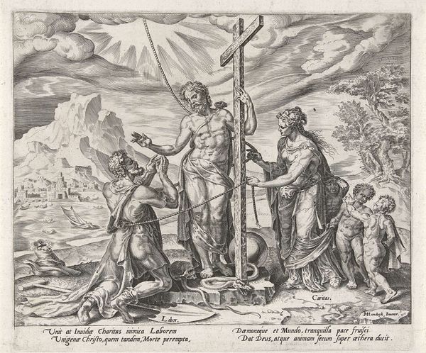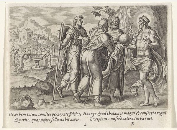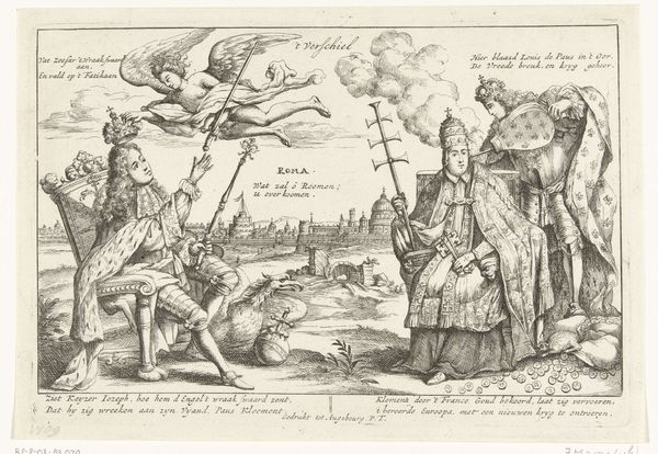 Editor: Here we have "Allegorical Print of the Duke of Alva and the Prince of Orange," made between 1568 and 1573 by an anonymous artist. It's an etching and engraving. It feels very crowded, with figures competing for space. How do you interpret this work? Curator: Let's focus on the formal elements first. Notice how the composition is divided, almost mirrored, around the central seated figure. The lines are incredibly precise and dense, creating a complex network of forms. Do you see how each figure is rendered with meticulous detail, emphasizing texture and pattern? Editor: Yes, I see the dense cross-hatching that creates shadows, especially on the clothing and in the landscape. It almost feels overwhelming. Curator: Precisely. The artist uses these techniques to create visual interest and to guide the viewer's eye. Consider the contrast between the heavily armored figures and the bare flesh of the allegorical nudes. This juxtaposition generates a visual tension. What is the effect of this, in your opinion? Editor: It makes the armored figures feel almost… trapped? While the nudes seem more vulnerable, maybe more honest? Curator: An insightful observation! Notice how the linear quality of the engraving lends itself to a distinct style, fitting within the Northern Renaissance tradition, valuing precision. It favors line over a painterly softening of forms. Consider the balance between form and content. Editor: I am now drawn to how distinct the lines between figures appear, contributing to the overall impression of… disagreement? Almost disharmony? Curator: An astute reading. By carefully studying its formal qualities and structure, the artwork delivers the intent so sharply and masterfully. Editor: It's amazing how much you can glean just from the way it looks!