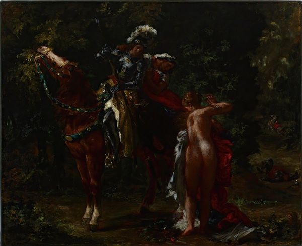 Curator: Standing before us is *Le Combat*, which roughly translates to The Fight, an oil painting attributed to Eugène Delacroix. Even without a confirmed date, it is a powerful example of his fascination with movement and dramatic action. Editor: Immediate chaos, right? My gut reaction is that this canvas is alive. The energy practically vibrates off it, a raw and almost unsettling kind of force. It feels less like observing and more like being caught in the crossfire of something ferocious. Curator: Delacroix, certainly at the heart of French Romanticism, saw art as more than representation. This, *Le Combat* in particular, highlights the human condition amid turmoil. What’s striking, historically, is his dedication to picturing complex histories with the Romantic intensity of emotion, which breaks away from more academic art. Editor: Exactly! And look at how those colors contribute— the murky greens and browns punctuated by flashes of bright red on those who are most likely the losing end of this fight; like flares of panic against inevitable odds. There's an inescapable grim beauty present. Curator: In this tumultuous composition, the diagonal thrust of the mounted figure—spear extended, bearing down on his enemies, embodies much about colonialism. Editor: The dark cape billowing out behind the central figure transforms him, at least to my eye, into a harbringer of fate or the allegorical equivalent of War itself. There's a somber message, and that I find absolutely bewitching. Curator: So it seems the piece captures conflict and emotion in Delacroix's world; perhaps it’s also a lens through which we might be examining those elements present even today. Editor: Precisely; it’s more than an image of strife frozen in time—a glimpse into Delacroix’s mind and heart as well. Powerful stuff, indeed!