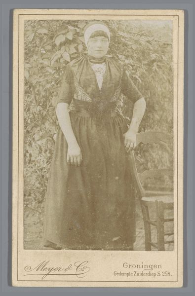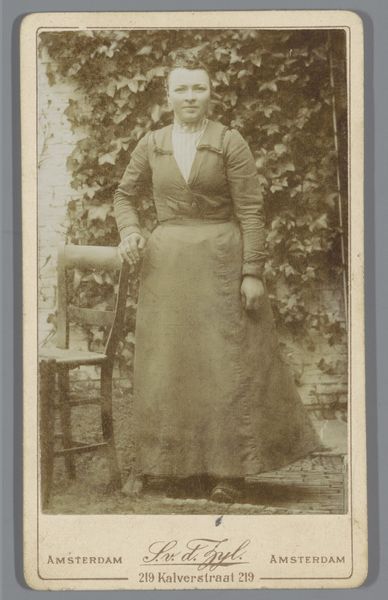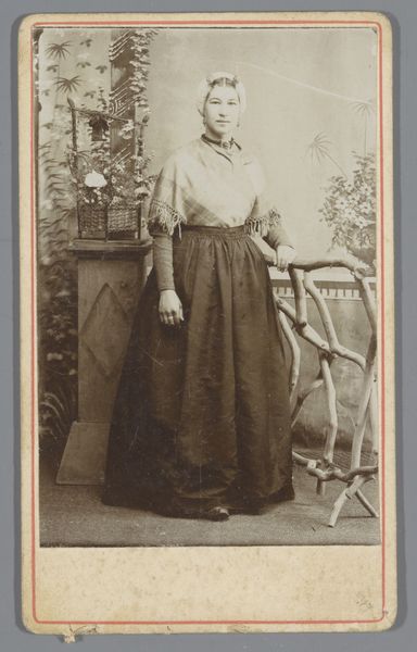 Editor: This is an old photograph, dating from around 1865 to 1900, entitled 'Portret van een onbekende vrouw met een mand aan haar arm, staande in een tuin' – which translates to 'Portrait of an unknown woman with a basket on her arm, standing in a garden' . It is a black and white photograph taken by Laurens Lodewijk Kleijn, which feels ghostly in its reversed contrasts. I’m really drawn to its dreamy stillness. What are your first thoughts on this, given its historical context? Curator: Ah, yes, a reversed photograph – like gazing into an alternate dimension. To me, it whispers tales of a world transforming. Consider: Photography was becoming increasingly accessible, capturing 'ordinary' moments for more people. Yet, staging, like we see here with the prop basket, and perhaps her Sunday best, remained crucial. Doesn't she seem both present and otherworldly? What do you make of that tension? Editor: That's fascinating! I hadn’t really considered the staged aspect so deeply. To me the setting gives off an ethereal quality. Do you feel there is any intention here with how the background interacts with the portrait? Curator: Absolutely. That garden acts like a theatre backdrop, doesn’t it? Framing her existence within nature. A question lingers, however: is the setting real, or another layer of artifice, chosen to enhance the "natural" beauty and virtue associated with women at the time? The blurry fence line hints, perhaps, at the limitations imposed on her, subtly. What does the basket whisper to you? Is it an echo of domesticity or an element to root her in our minds, despite all of its abstract qualities? Editor: That’s a great point - the setting really blurs the line between authenticity and something constructed. As for the basket - I can see the domestic symbolism, but I hadn't considered the sense of imposed limitations. It really puts it into perspective how portraits can have such intricate and complicated hidden messages. Curator: Exactly! It is a portal into a hidden narrative. It's like unearthing secrets buried in plain sight! Editor: Yes, indeed. This photograph now feels far more multifaceted than when I initially viewed it!