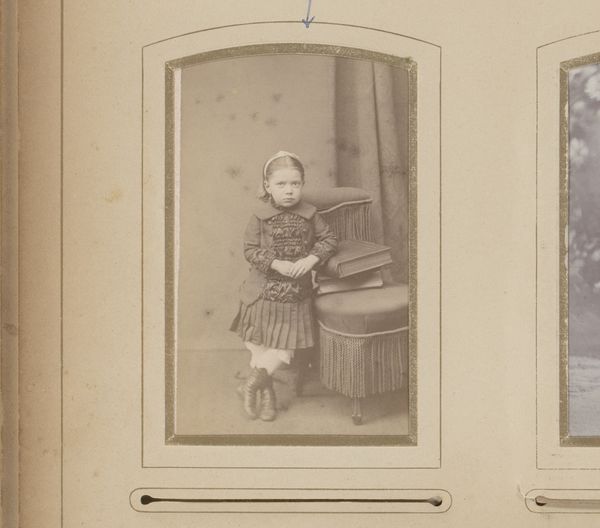 Editor: Here we have "Portret van Emma Posh," a photograph taken sometime between 1861 and 1890 by Albert Greiner, currently held at the Rijksmuseum. Looking at it, I’m struck by the young girl's very formal posture, and I wonder, what do you see in this piece beyond just a historical portrait? Curator: It's more than just a record of appearance, isn't it? Think about photography’s rise coinciding with shifting societal expectations. This controlled environment—the girl's pose, the meticulously arranged furniture—speaks to a rising Victorian ideal of domesticity and female virtue. Can we read it as an example of power dynamics in gender? Editor: That’s an interesting take. I hadn't considered how constructed the image is. Is that what those curtains in the background signal? Curator: Precisely! Those elements weren’t arbitrarily selected; they signify a curated identity meant for public consumption. Now, who has access to that kind of curated self? Who is allowed to create their own identity? Do you see anything in her face that shows the discomfort with that social demand? Editor: I think I do... Her slightly tense posture now seems more telling, as though she were pushing against those constrictions. I'm glad I now can look at this piece and ask those questions of access and the tension it creates for those involved. Curator: Absolutely. By questioning these historical power structures, we can understand how visual representations impact contemporary issues of identity and representation today. Thank you for this enlightening conversation!