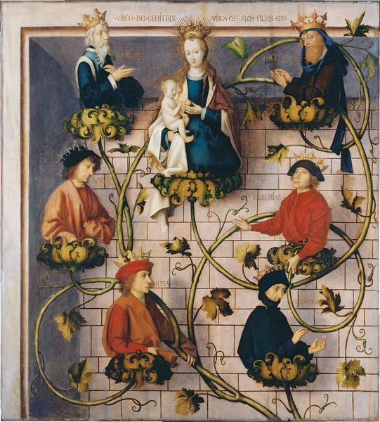 Pictured here symbolically is Christ’s family tree. It grows out of the sleeping figure of Jesse, forefather of a line of kings that included, according to tradition, Salomon, David and Jesus.The branches are filled with the kings of Israel, among them King David with his harp. At top, the Virgin is enthroned with the Christ Child on her lap.