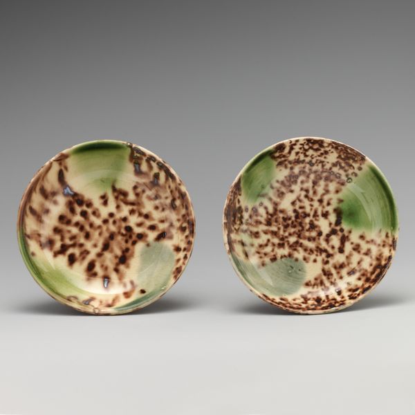 Editor: Here we have a ceramic tea caddy from 1750-1775, likely Whieldon type, housed in the Metropolitan Museum of Art. The mottled glaze is quite striking; it almost resembles a landscape contained within this small vessel. How would you interpret this piece, focusing on its visual aspects? Curator: Focusing on its materiality, we see an object defined by its verticality, divided into two distinct cylindrical forms capped by a rounded lid. The interest, visually, resides almost entirely in the glaze. The seemingly random distribution of greens, browns, and creams invites contemplation of the alchemic processes inherent in ceramic production. Consider how the artist has allowed, or even encouraged, a certain degree of chance in the glazing. Does that suggest anything to you about its function? Editor: Perhaps the intent was less about precise control and more about embracing the natural effects achievable with ceramic. Is that asymmetry indicative of a Rococo aesthetic? Curator: Precisely. Rococo, while often associated with ornamentation, also celebrated asymmetry and organic forms. The mottled glaze, lacking a clear pattern, echoes that sensibility. We also should appreciate its function as a tea caddy: it elevates the everyday to the level of art, intertwining function and aesthetics. Note also, that without its glaze, it's simply a functional jar; its surface therefore serves as its primary identity. Editor: I see now how the glaze becomes the defining feature, turning a simple container into something visually compelling, resonating with the Rococo spirit. Thank you! Curator: Indeed. And understanding the interplay between material, form, and surface reveals much about its aesthetic intentions and the period that produced it.