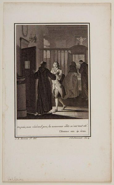 Curator: This is an illustration by Joseph de Longueil. Dating back to the 18th century, it resides in the Harvard Art Museums collection. Editor: The stark black and white lends it a dramatic air. I’m struck by the contrast between the finely dressed couple and the man being apprehended. Curator: Absolutely. Longueil's work reflects the era's societal tensions. This piece, though lacking a specific title, seems to speak to power dynamics and justice. Considering his lifetime overlapped the French Revolution, this narrative gains depth. Editor: And the details of the printmaking process itself, the etching lines, give a sense of the meticulous labor required to produce imagery for widespread consumption, reflecting the social hierarchies of artistic production. Curator: The vulnerability of the subdued man evokes questions about the fairness of the prevailing social order. Longueil challenges us to confront injustice and its implications across gender and class lines. Editor: A powerful image, from its physical making to its thematic implications. Curator: Indeed, it urges us to consider the artwork's place within the broader historical context.