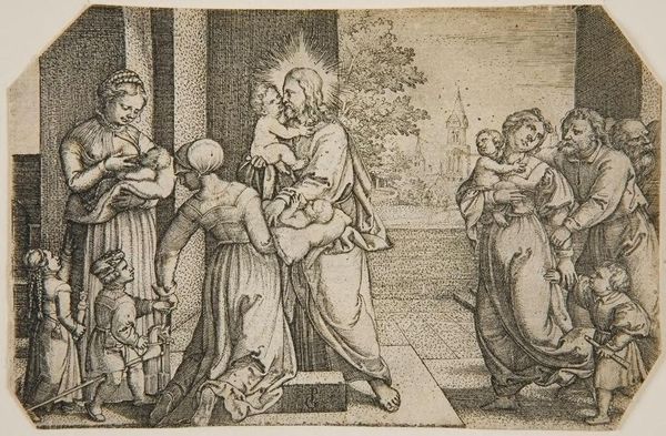 Editor: Here we have "The Holy Family with Saint Elizabeth and John the Baptist" by Giacomo Francia, created sometime between 1490 and 1557. It's an engraving, which gives it this really interesting textured look. What strikes me most is how everyone's looking in different directions, creating a kind of silent drama. What do you see in this piece, beyond the immediate family tableau? Curator: Ah, yes, the scattered gazes! For me, this engraving is a beautiful whisper from the Italian Renaissance. Notice how Francia melds the sacred with a touch of earthly charm. There’s Mary, ever serene, but Elizabeth… she’s engaged, almost conspiratorial. It's not just a depiction of holiness; it's a peek into a lived reality, wouldn't you say? Are you drawn to any particular relationship represented here? Editor: I'm really interested in the dynamic between baby Jesus and John the Baptist, the way they're both presented. Jesus is with Mary, sort of in her care, and John the Baptist has this contraption behind him. Is there a symbolic reading here? Curator: Precisely! John's placement, with that intriguing object - likely a baptistery font model, I imagine! - hints at his future role, a stark contrast to Jesus' present dependency on Mary. The composition almost suggests a preordained path for each child, intertwined yet distinct. Perhaps Francia is suggesting a future still unwritten. Editor: I hadn’t thought about that at all. It's amazing how much meaning can be packed into a single image, isn’t it? I am left feeling very unsettled. Curator: Art, at its best, is just that – a springboard for contemplation, offering endless interpretations and unsettling certainties. And maybe that’s its own kind of truth. I am grateful we took this small but challenging leap.