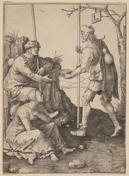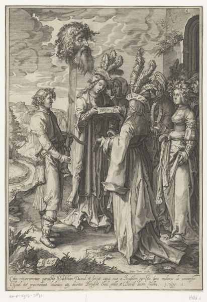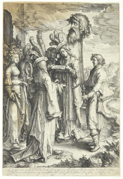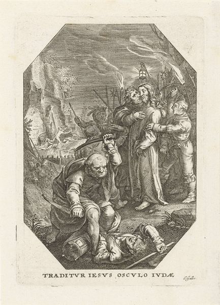 Curator: So, we're looking at "The Betrayal of Christ, from The Passion of Christ" created around 1598 by Hendrick Goltzius. It's an engraving, teeming with figures caught in a really dramatic moment. What grabs you first? Editor: It feels claustrophobic! That dense cluster of figures, almost swallowed by the swirling lines of the sky and the woods behind them...it's chaotic and tense. There's barely any breathing room in this little world. Curator: That sense of being hemmed in is deliberate. Goltzius crams the composition to emphasize the emotional intensity. You've got Judas' kiss right there in the center—the focal point—but it’s almost lost in the turmoil. It speaks to how betrayal often hides in plain sight, cloaked in intimacy. Editor: Exactly. And that kiss, a sign of affection turned into a marker for violence…It's disturbing how casual it seems against the raw energy of the flailing soldiers. Notice Peter cutting off the high priest's servant Malchus’ ear right in the front; below them you can see him lying there, vulnerable, helpless. Curator: Goltzius had a fascination with classical forms, but he always imbued them with this kind of nervous energy, very characteristic of the late Northern Renaissance. There is the weight of religious expectation mixed with something volatile and human. Take the light, for example. You see the flickering torches casting eerie shadows, adding to the sense of unease. Light, classically a symbol of divine truth, now a source of flickering deceit. Editor: And the individual faces… They're not just types. Each figure is given a really specific expression—anger, fear, brutality. They all add layers of motivation that point to much bigger themes. The collapse of values; institutional violence. Even Judas doesn't strike me as purely evil. There's something… troubled there, like he is compelled, but his kiss is devoid of warmth. Curator: Right, we’re faced with such difficult symbolism—an almost unbearable condensation of power, guilt, devotion, and their undoing. The drawing isn't trying to just tell a story; it's forcing us to confront our own understanding of those themes, and more pressingly, ourselves. Editor: In the end, the choice isn’t just to recall The Bible, but to explore this whole theater of gesture. I’m not sure if I could feel peace with this piece, but at least I find some brutal awareness.