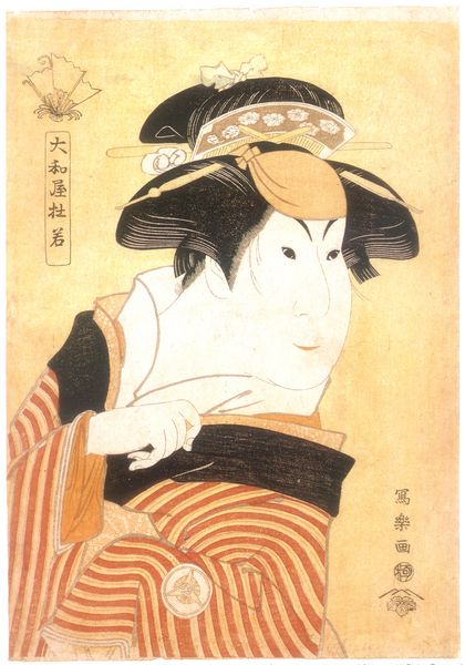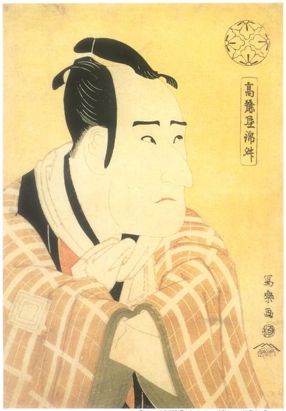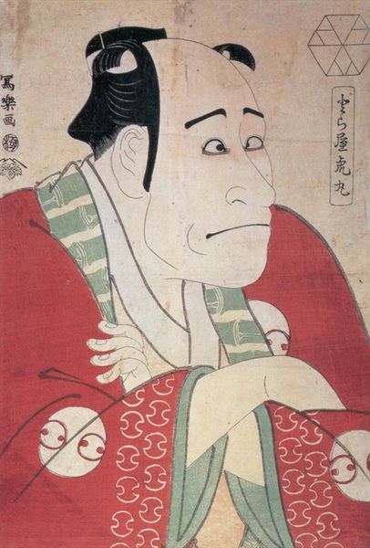 Editor: This is a woodblock print from 1795 by Tōshūsai Sharaku, titled "Kikunojō Segawa III as Nakai Ohama in Hana No Miyako Kuruwa No Nawabari." There's a striking exaggeration to the features of the figure depicted, and a somewhat unsettling quality to the gaze. How do you interpret this work? Curator: Notice how Sharaku uses the actor’s exaggerated features to tell us a deeper story. Caricature wasn't merely for laughs; it was a way to capture the *essence* of a character, and to comment on societal roles. Do you see how the symbols embedded in the clothing might relate to themes within the play, perhaps of social status? Editor: Yes, the circular emblems on the kimono seem like they could represent something beyond mere decoration. It’s as if Sharaku is hinting at layers of meaning beneath the surface of this kabuki performance. Curator: Exactly. Kabuki itself is steeped in symbolism. Sharaku captures the tension between public performance and private identity. The large head, the set mouth, the stylized hair... all contribute to a codified representation, immediately legible to contemporary viewers. What lasting impression does that visual vocabulary have on you today? Editor: It makes me consider how performance shapes our perception of identity, both then and now. The visual language may be different, but the underlying themes still resonate. Curator: Precisely. We can almost feel the echoes of ritual and representation bouncing through the ages! By understanding these symbols, we’re better able to decipher the messages within the art and consider the influence cultural memory has on shaping both it, and our reaction to it.