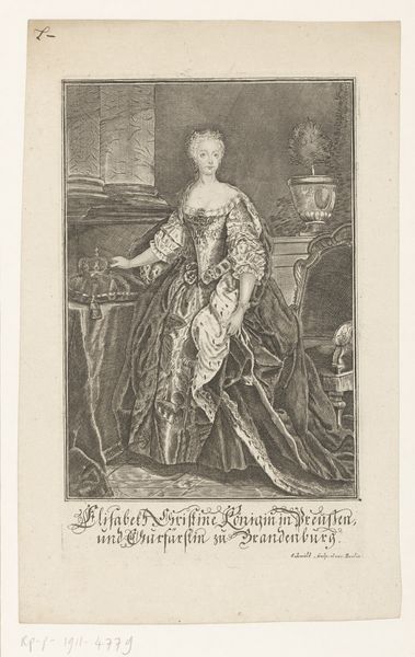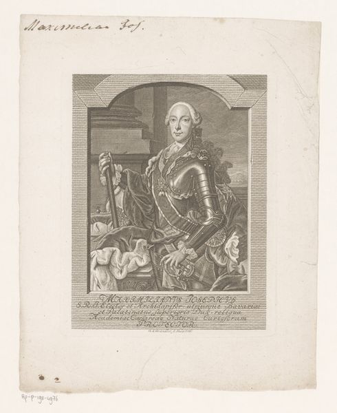 Joseph Anton Zimmermann created this engraving of Theresia Emanuela of Bavaria sometime in the 18th century. Zimmermann, a German artist, here depicts Theresia as a young woman of status and wealth. During this period, portraiture played a critical role in defining social hierarchies. The sitter's clothing, pose, and setting were all carefully constructed to convey messages about their identity, family, and social standing. Here, Theresia's elaborate gown and refined bearing speak to her aristocratic status, while the architectural backdrop alludes to the palaces and estates that were typical of her class. This image could have been commissioned by the sitter to demonstrate their status in society. The engraver or printmaker played a vital role in disseminating images and information throughout society. To fully understand this image, a social historian might consult resources such as genealogical records, fashion history, and studies of courtly life in 18th-century Europe.