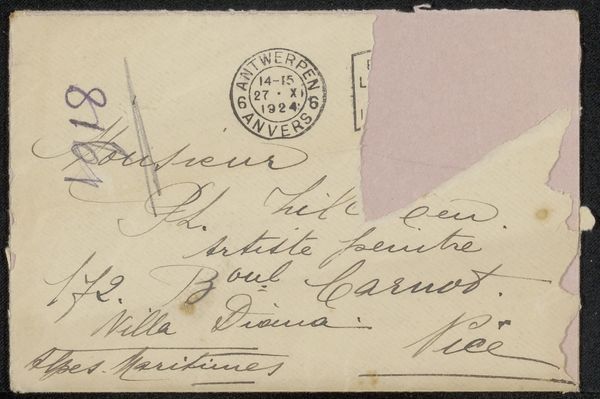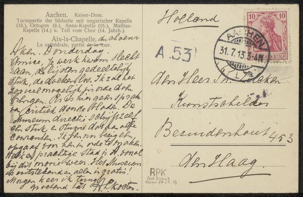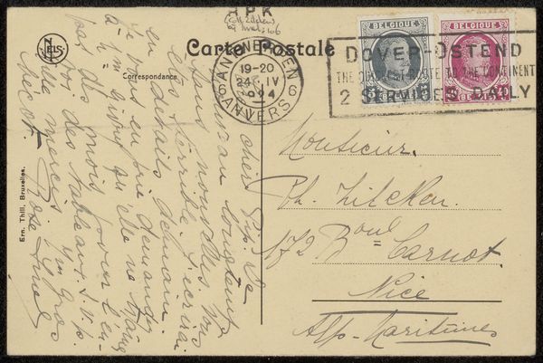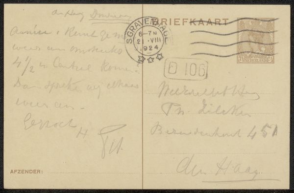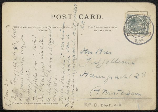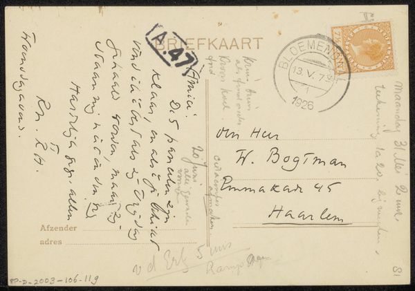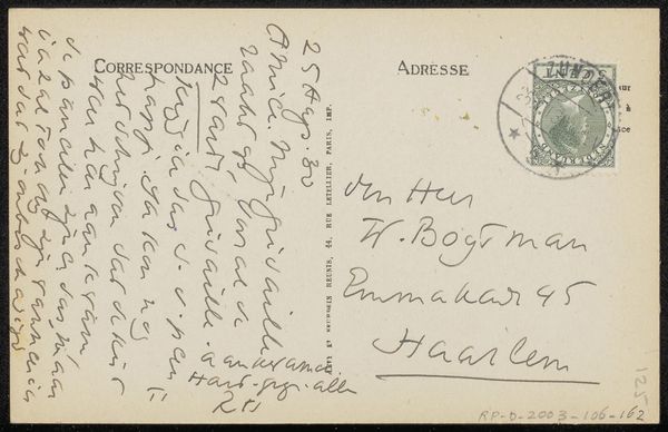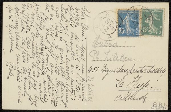 Curator: Here we have “Prentbriefkaart aan Philip Zilcken,” a postcard dating from before 1929. It’s an ink and pen drawing. What are your initial thoughts? Editor: The first thing that strikes me is the density of the writing; it feels like an intimate personal correspondence. There is a very appealing tactile quality implied, too, due to the physical traces of pen on paper. Curator: Indeed, the postcard format itself speaks to a particular moment in social history. Before the ease of electronic communication, sending postcards like this was a common way to maintain connections. Editor: Thinking about the composition, there's a clear division between the right and left sides, one bearing a formal address, stamp, and postal markings, the other densely packed with cursive text that defies easy decipherment to my eye. Curator: The postal markings, “Orne, France” along with “Paris,” reveal something about the journey it took. Postcards facilitated both tourism and business communication during a pivotal shift to globalization, shaping modern society’s concept of distances and information transfer. Editor: Precisely! I am thinking of how postcards like this serve as miniature documents of their time. The very materiality--the ink, the weight of the card stock itself—tells a tale about its conditions of creation. Curator: You have mentioned its formal nature and it begs the question, what narratives are hidden within these penned words? Editor: That's a fascinating point; one is tempted to engage in linguistic archeology to decipher that historical context. It presents itself as an immediate, accessible format and contrasts with the secrets veiled behind handwriting and now anachronistic colloquialisms. Curator: Analyzing that dense script and postmark gives us insight into communication networks in a time without immediate digital access. Considering what we've observed, both of us now find new interest in similar everyday objects as precious documents, don’t you think? Editor: Yes. Looking at something that would otherwise be dismissed, you’re making me see deeper by highlighting a fascinating blend of visual and textual information.