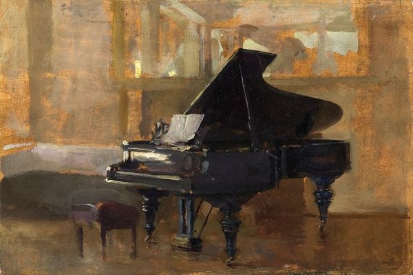 Editor: We’re looking at "Pianospelare," an oil painting created in 1907 by Elin Danielson-Gambogi. The immediate impression is one of quiet domesticity, a glimpse into an intimate moment. What story do you think this painting tells? Curator: It's tempting to see this scene as purely aesthetic, a snapshot of bourgeois life. But let's consider the broader context: Danielson-Gambogi was a Finnish artist working at a time of intense political and social upheaval. Finland was under Russian rule, and questions of national identity and women’s roles were at the forefront. Do you see anything in the composition that hints at this underlying tension? Editor: I notice how the pianist is partially obscured by the piano itself, and the light feels concentrated only over the instrument. There's a sense of enclosure, perhaps even confinement. Curator: Exactly. Consider that music was not just entertainment but also a powerful tool for cultural expression and resistance. Danielson-Gambogi, as a female artist in a patriarchal society, might have found in music a space for agency and self-expression. How does viewing the subject of "genre-painting" through this intersectional lens alter our understanding of the work? Editor: It makes it less of a passive domestic scene and more of a statement about the artist's place in society, using the act of playing music as a subtle form of rebellion, perhaps. Curator: Precisely. The seemingly tranquil scene masks a deeper exploration of identity and resistance. Recognizing these layers allows us to connect the painting to broader socio-political conversations and unpack what the symbolism tells us. Editor: That's a really interesting point; I will remember to view artworks using the same method from now on. I'll look deeper than just its pure aesthetic appeal and attempt to put the artwork into historical context.