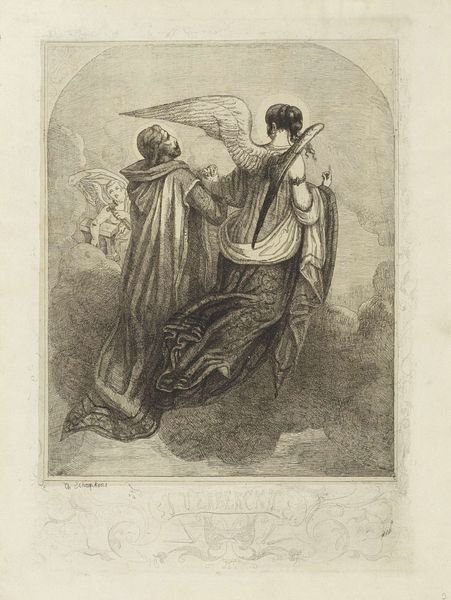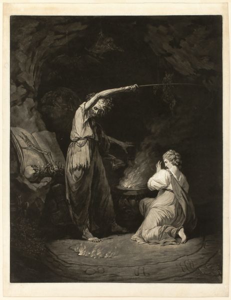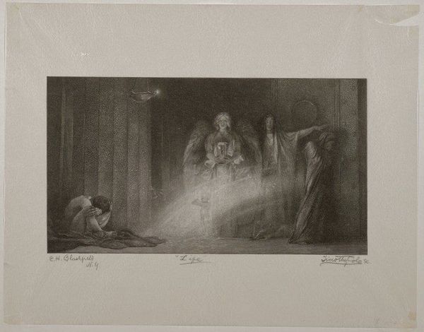 Editor: Fantin-Latour's "Manfred and Astarte" presents a spectral encounter in black and white, rendered with such dramatic contrast. What do you see in the stark formal arrangement of this print? Curator: The composition pivots on a dynamic interplay of light and shadow, strategically deployed to articulate form. Observe how the artist uses line to delineate Manfred's desperate posture against the ethereal figure of Astarte. The stark chiaroscuro amplifies the emotional intensity. Editor: It almost feels like a study in tonal values. Curator: Precisely. Consider the formal structure. Note the careful distribution of dark masses against lighter areas, creating a visual rhythm. How does this formal balance impact your interpretation of the narrative content? Editor: It emphasizes the tension between Manfred and Astarte, the earthly versus the ethereal. I hadn't considered the structure so literally. Curator: A keen observation. Fantin-Latour masterfully uses formal elements to reinforce the thematic concerns of the artwork.