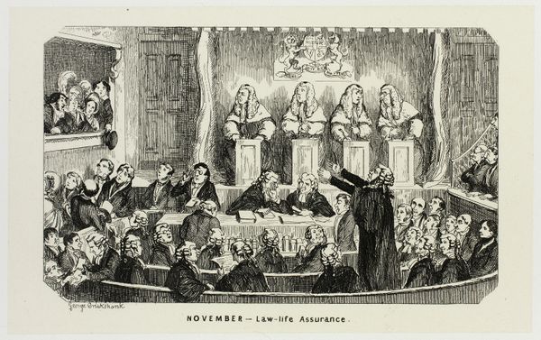 Curator: This ink and pen drawing is titled "Crainquebille" and was created by Théophile Alexandre Steinlen. It's a fascinating piece of graphic art, showcasing his realism style. Editor: The initial impression is definitely weighted with gravity. You’re pulled in, observing a rather stark courtroom scene bustling with observers, jurors, lawyers—the full panoply of judicial drama! A pen sketch can feel so immediate. Curator: It truly does capture a specific moment. Look closely, and you'll find powerful symbols subtly placed to enrich the visual narrative, like the crucifix above the judge—a powerful statement about judgement, justice, and moral law that echoes throughout Western culture. Editor: It’s incredible how such detailed and expressive faces can be created with minimal lines, too! The contrast between light streaming through those towering windows and the dense crowd really brings focus. Curator: Absolutely, Steinlen masters the manipulation of light, but equally significant is the narrative. The entire scene reads like a theatrical production, with each character assigned their role in this drama of societal justice. And in its rendering, note the social consciousness often displayed by artists associated with the realities of modern life. Editor: True. One might see here the classic struggle. It’s almost oppressive—yet hopeful, as the bright windows seem to let in new ideas or an impending verdict. The pen-and-ink style actually adds another layer. Something about stark black and white simplifies complex realities down to fundamental contrasts. Curator: I would also encourage listeners to think about this work within its historical context. The setting is significant because courtrooms can reflect cultural values and are an established visual shorthand for power structures. We, as the observers, also participate in an act of judging and questioning authority. Editor: So powerful. Thinking of other drawings, Daumier’s court scenes spring to mind, too— the satirical punch that he delivers in seemingly realistic works! This is a little different. I find more of an implicit challenge to something ingrained in this legal mise-en-scène here... It stays with you, unsettling you softly, like a poem read late at night. Curator: Precisely. This courtroom comes to us not merely as a scene of civic action, but a window through which the universal search for fairness reflects back at the human condition, offering an aesthetic experience ripe with symbolic contemplation. Editor: Well, there we have it—Steinlen's sharp-lined social drama in simple blacks and whites that gets us to look at the many shades of justice.