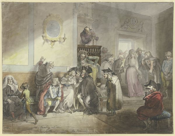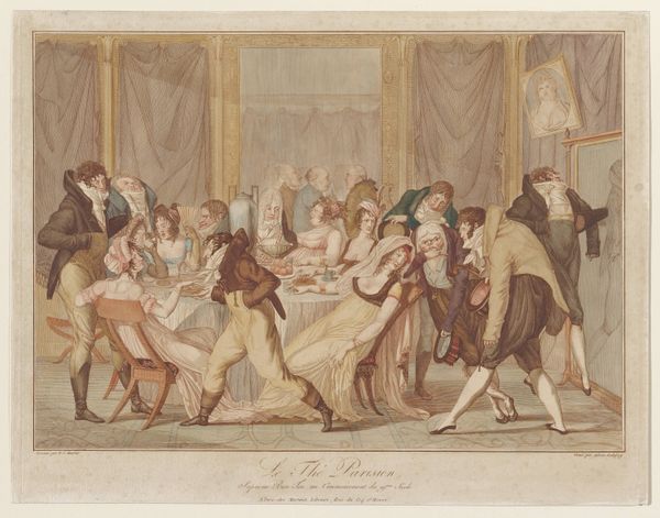 Louis Charles Ruotte created this print called “Bal de Société” using etching and engraving techniques in France, likely around the late 18th century. It depicts a society ball, offering a glimpse into the social rituals and hierarchies of the time. Notice how Ruotte uses visual cues to comment on the social structures of his time. The figures are arranged to emphasize the power dynamics between the classes. The setting of the ball itself speaks to the opulence and leisure enjoyed by the aristocracy while in the background, the musicians perch on columns, signifying their supporting position. The print could be seen as a commentary on the decadence of the French court, made in the years leading up to the French Revolution. For instance, the figure in the right foreground wearing a Harlequin costume references traditional Commedia dell’Arte, an art form which often involved the mockery of aristocratic culture. Understanding this artwork involves researching the social customs, class dynamics, and political tensions of late 18th-century France. It is a valuable historical document revealing the intersection of art, society, and power.