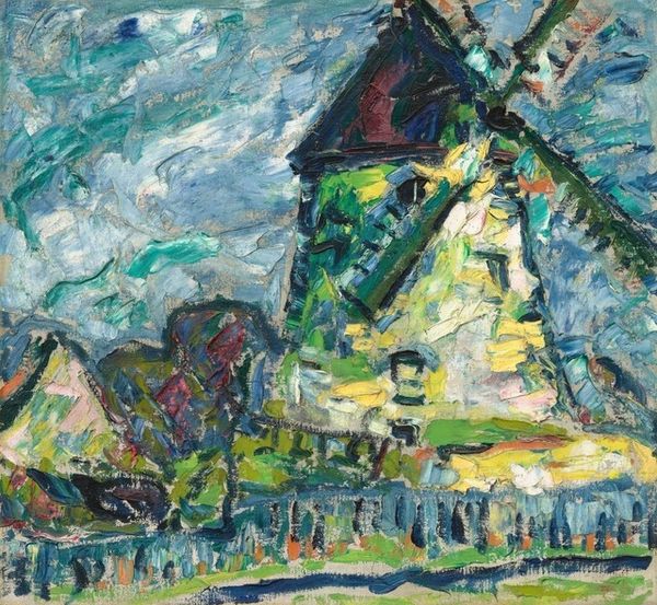 Curator: Looking at Kirchner's "Fehmarn Houses" from 1908, I'm immediately struck by how turbulent yet strangely comforting it feels. It's like a cozy nightmare. Editor: Cozy nightmare, I love that! To me, it feels almost carnivalesque, but with a slightly menacing undertone. Kirchner's thick application of oil-paint really makes those cottages in Fehmarn practically vibrate, wouldn’t you agree? Curator: Absolutely, the materiality itself feels radical. Now, "Fehmarn Houses" occupies an interesting space within the historical narrative of Expressionism and even brushes against Fauvism. Painted during Kirchner's pre-Die Brücke period, one can trace its lineage back to Van Gogh's emotionally charged landscapes while recognizing the genesis of what will become the group's signature style. It reflects not only the formal innovations but also anxieties of pre-war Germany. Editor: Anxieties, definitely, though there’s a naivete, too. See how those buildings sort of huddle together? And that massive tree on the right, almost guarding the village? It's like he’s both celebrating the simple life and warning against some impending doom – painting what he feels more than what he sees, I bet! That blue… it is almost an after-image. Curator: It speaks to a conflicted national identity too, grappling with rapid modernization. The return to landscapes can be seen as a utopian impulse, an escape, while those distorted forms also mirror a societal unease percolating beneath the surface of bourgeois comfort. His choices, therefore, resonate with socio-political resistance in its own manner. Editor: I wonder if anyone on Fehmarn Island felt Kirchner was capturing *their* truth back then, or if they thought, “Who’s this crazy painter making our homes look like they’re about to melt?” The magic of art, though, is that he has preserved that reality as seen through his eyes. Curator: Yes, this particular moment through his singular lens offers so many avenues into understanding Kirchner's oeuvre and the cultural dynamics of the period. I'm especially taken by how he reclaims the rural setting, offering a very nuanced comment on tradition versus progress. Editor: And for me, it's that lingering feeling—like I’ve stepped into a place both familiar and alien, a world on the verge of some significant… change. Thank you, Kirchner, for keeping us on our toes a century later!
