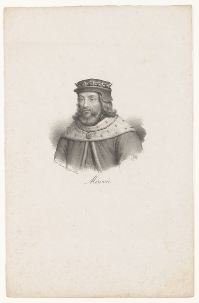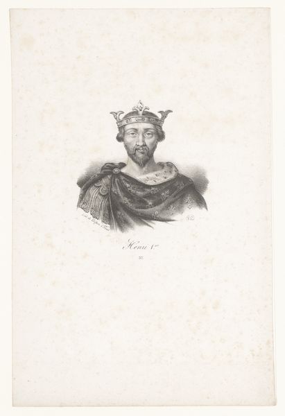 Nicolas Maurin created this portrait of Hugo Capet, King of France using engraving. The image is a study in contrasts, a play between light and shadow that gives depth to the figure. Observe how Maurin uses delicate lines to define the king’s features, from the contours of his face to the intricate details of his crown. The composition centers on Hugo Capet, adorned with symbols of royalty—the crown and a robe decorated with fleur-de-lis. These elements are more than mere decoration; they are signs, loaded with historical and cultural significance. The artist’s choice to present Capet in this manner speaks to the 19th-century fascination with historical figures and the romanticization of royal power. Consider the way Maurin’s engraving technique captures not just likeness but also an idea of kingship. This artwork does not offer a straightforward depiction, but is an invitation to decode the visual and historical signs embedded within it.