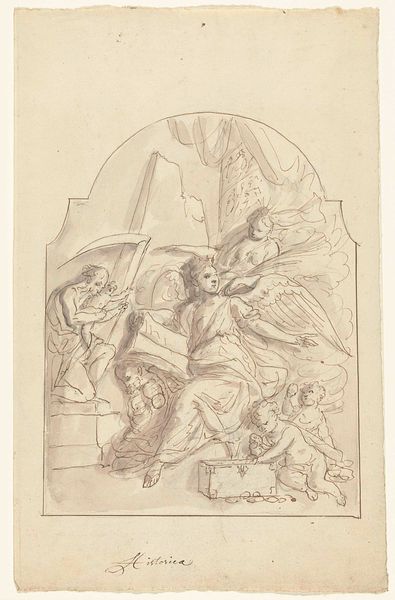 Editor: So, this ink drawing by Johann Kaspar Sing, titled *Enthauptung eines Heiligen vor einer Götterstatue* depicts, well, a beheading. It's incredibly detailed and dramatic, even though the date of creation is unknown. What stands out to me is the central placement of the beheading itself, but there's this other world above with heavenly figures and then off to the side a large pagan idol, almost indifferent to the sacrifice taking place. What do you make of that? Curator: It's interesting that you immediately picked up on that spatial tension between the divine and the earthly, especially in a Baroque context. I see this drawing as an examination of power and the narratives that underpin it. Sing is staging not just a historical event, but also a cultural collision—a holy figure facing martyrdom, framed by both pagan idolatry and Christian iconography. It raises crucial questions. What did martyrdom mean in this period? Who controlled the narrative around these figures? Editor: So it’s more than just depicting a past event? Curator: Exactly. The Baroque period was rife with conflict, both religious and political. Sing is potentially asking us to consider the complexities of religious conversion, and to see the martyr not as a passive victim, but as an active participant in a power dynamic. Who benefits from this spectacle, the executioners, the observing crowd or the emerging religion itself? What does it say about the intersection of faith, power, and spectacle in shaping collective memory? Editor: I never thought about martyrdom as a spectacle with all those power dynamics you describe. I always considered the past a fixed entity that is immune from questions in the present day, so these critical frameworks open a whole new way to interact with art history. Curator: Indeed, viewing art through this lens encourages us to question established historical narratives and prompts us to consider the marginalized perspectives and forgotten stories. We must continually revisit how historical accounts are often formed. Editor: This discussion made me think about what is represented and, even more importantly, what is strategically omitted from history. Curator: Precisely.