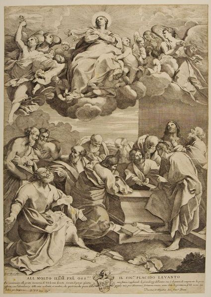 Curator: Giovita Garavaglia's "Assumption of the Virgin," currently residing at the Harvard Art Museums, presents us with a classical rendering of a pivotal scene. Editor: It's striking how Garavaglia uses the stark contrast to create this dramatic division between the earthly and the heavenly. One wonders about the engraving process. Curator: The composition itself speaks volumes. Note the clear delineation between the apostles clustered below and the ascending Virgin surrounded by angels. Semiotically, we see a transformation from earthly lament to divine glory. Editor: Right, and this reproduction raises interesting questions about accessibility. How did prints like this circulate, and who had access to them? Was this meant for devotional use or broader dissemination? Curator: Precisely. The upward gaze of the apostles underscores the focal point, directing our own gaze heavenward. The work invites us to consider the narrative's theological underpinnings and the artistic traditions from which it springs. Editor: It offers a glimpse into the labor and means of production that allowed such images, and therefore ideas, to circulate more widely. Fascinating to consider its life beyond the church.