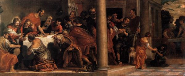 Curator: This is Paolo Veronese’s “Martyrdom of Saint Sebastian,” painted around 1565. Veronese, of course, was a leading figure in the Venetian High Renaissance. Editor: It’s immediately striking. The painting pulsates with a kind of violent energy, doesn't it? The composition is almost overwhelmingly dense, filled with figures in motion. Curator: Precisely. It reflects the theatricality that was very much in vogue, part of a broader cultural investment in dramatic spectacle. Note how Veronese uses color, especially the reds and whites, to guide the eye across this chaotic scene. It invites you into the spectacle of the martyrdom. Editor: And yet, I find myself troubled by the celebration of such explicit violence. The suffering of Sebastian is on full display, and we, the viewers, become complicit in the gaze. It's difficult to reconcile the beauty of the painting with the brutality it depicts. It almost glorifies oppression, doesn't it? Curator: I see your point, but one must remember that these religious paintings served as didactic tools. They reinforced religious beliefs and social order, for a public accustomed to the era’s violence in ways quite foreign to us. Art and religion served very specific societal roles at the time. The work served as a tool in reinforcing the position of power for institutions in charge. Editor: But hasn't art always been political, whether consciously or unconsciously? This work naturalizes a worldview, placing certain bodies in positions of power, and others in subjection. Shouldn't we be critical of how these power dynamics are represented? Also I’m wondering if this wasn’t a cry for social change camouflaged as a piece of Christian art? Curator: Perhaps both are true, a powerful visual statement on power relations rooted in Veronese's context. Thank you. Editor: Yes, by grappling with the complexities we bring a fresh understanding to the work of Veronese and challenge the long held narratives in art history.