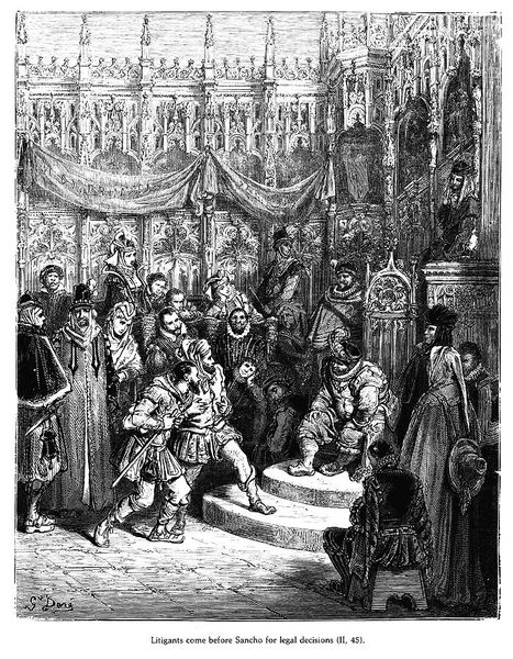 Editor: So, we're looking at an engraving by Gustave Doré titled "Don Quixote." It’s packed with figures, and honestly, a bit unsettling with all those spears pointed upwards! What's your initial impression? Curator: You know, "unsettling" is a great word. It reminds me of a dream, the kind where reality blurs and you're surrounded by slightly menacing caricatures. Doré was a master of light and shadow, wouldn't you say? Notice how he uses the deep blacks to create this overwhelming feeling, as if Sancho Panza – looking like a melon about to burst, wouldn't you say? – is stumbling through not just space, but a dark night of the soul. And those bulbous bellies! They’re the kind of exaggerated features a street artist might use, right? Do you think there's a connection to social satire here? Editor: Definitely. It feels like a mocking portrayal of power. But, beyond the satire, is there something else we should be noticing about the composition itself? Curator: Ah, yes! It's easy to get lost in the details. Doré cleverly uses the spears, for example, to lead your eye upward, making the scene feel even more chaotic and endless, while all that weight on the bottom anchors us in the absurdity of the immediate moment, don’t you agree? A very strange way to organize it all! What do you make of it? Editor: It’s like Doré is trapping the viewer, visually and emotionally, between aspiration and the heavy, grotesque reality. Curator: Precisely! I also love the thought that this entire dramatic invasion exists entirely in Sancho's deluded mind, or perhaps, ours? What do you make of that? Editor: Absolutely, it pushes me to question my own perception, much like Don Quixote did. Thanks for your perspectives, that gives me something to think about!