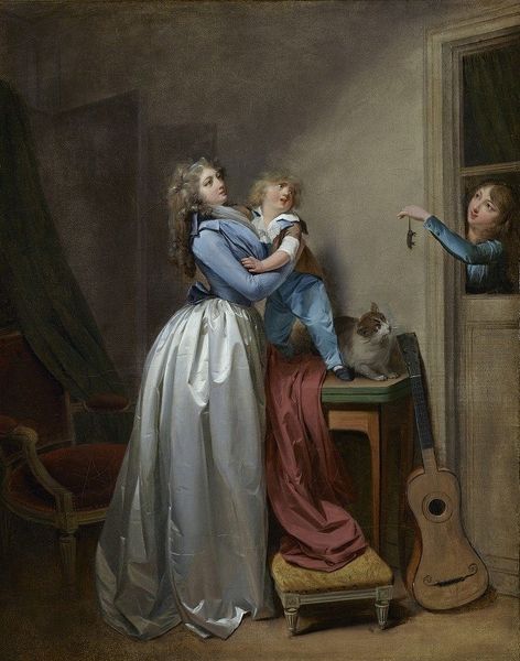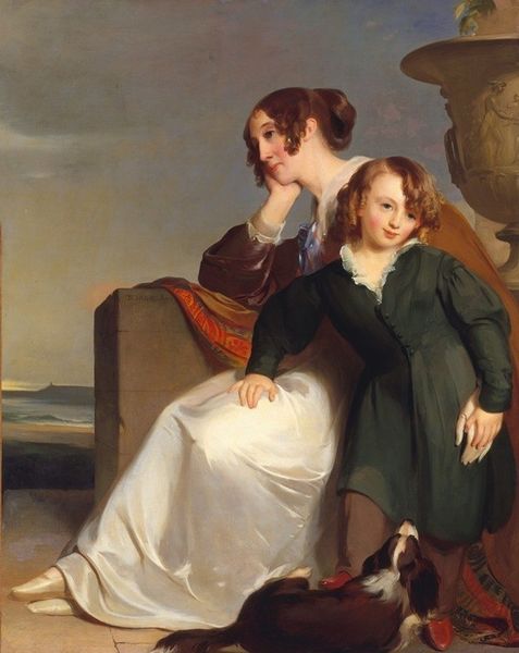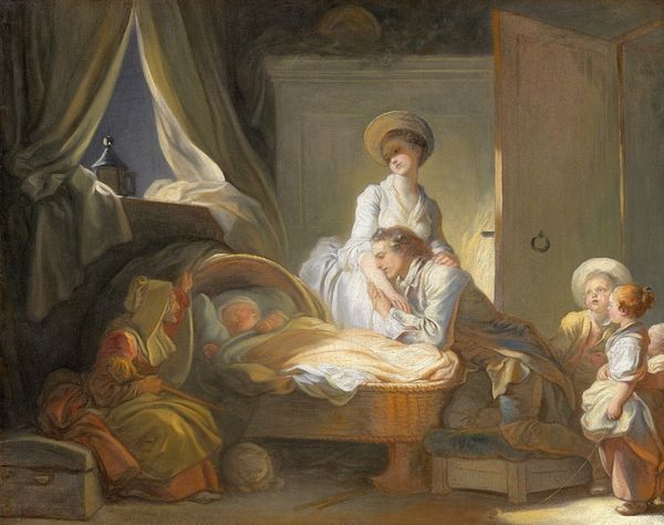 Curator: I'm immediately drawn to the painting’s somber, yet comforting mood; it's an intimate portrayal of a mother and child rendered with delicate brushstrokes, capturing the soft glow of what I presume is late afternoon light. Editor: Indeed. The painting is entitled "Bedtime", an 1858 oil on canvas by William Powell Frith, a British artist known for his narrative genre scenes and portraits. He captured Victorian life, often with a focus on the middle and upper classes. Curator: The details are intriguing, especially the mother's elegant attire. Her gaze is thoughtful, almost melancholic. What social constructs inform how we perceive motherhood within this composition? Is it sentimental idealization, or a more nuanced view? Editor: Examining Frith's "Bedtime" through the lens of Victorian England reveals much. Consider the period’s emphasis on domesticity. The scene celebrates motherhood, yes, but it also subtly reinforces prevailing social norms. The presence of what seems to be a servant's outfit haphazardly thrown over the chair is a gentle reminder of Victorian society's silent exploitation. Curator: I am intrigued by the tension in her expression; this piece challenges the simple Madona/Whore complex by showing that mothers also have to manage staff, think, be intelligent...It shows more than simple maternity. Editor: Frith exhibited paintings like this one at venues that served as gathering points for the rising middle classes who felt empowered through artistic consumption, giving him both an artistic career, but equally allowing him to become a form of gentle socio-political commentator. Curator: And the little boy, perched on her lap, clad in his nightgown, feels like an extension of her. What are your thoughts? Is it a sentimental portrayal, or something deeper? Editor: There is undeniably an element of idealization, catering to Victorian sensibilities; however, the artist captures a certain authentic intimacy between parent and child through careful representation, elevating "Bedtime" from mere sentimental cliché to something more psychologically resonant. Curator: Considering its time, and what it reflects about mothers and children, what we expect of them, "Bedtime" provides valuable socio-historical insights, prompting questions about identity, family, and representation. Editor: Agreed, it serves as a poignant artifact that invites both historical analysis and contemporary reflection.