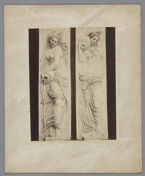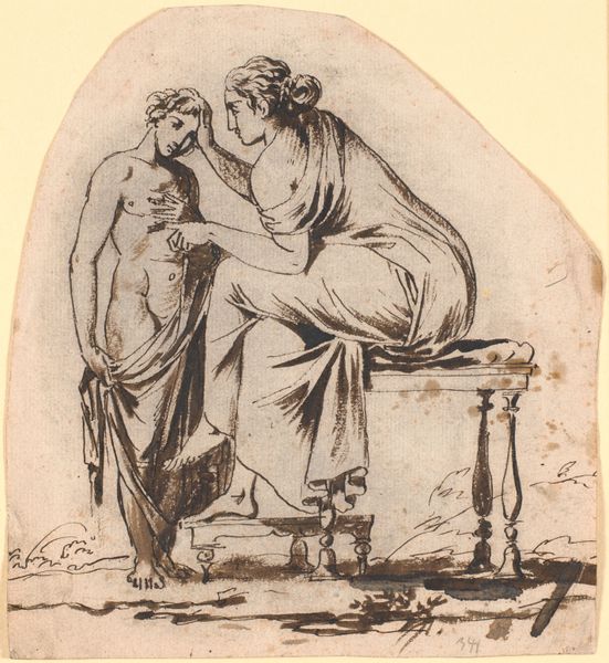 Curator: Here we have Johann Heinrich von Dannecker’s “Clio and Melpomene,” a drawing rendered circa 1800. It's currently held at the Städel Museum. It employs pencil and ink, quite delicately, I must say. Editor: My first thought? Melancholy, like a muted song. There’s a gentleness to the lines, yet an undeniable seriousness in their expressions. They almost seem to be sharing a secret. Curator: Indeed. Dannecker here depicts two of the nine Muses from Greek mythology. Clio, on the left, represents history. Melpomene, on the right, is traditionally the Muse of tragedy. Editor: The tragedy part definitely rings true. Look at how Clio is leaning in, almost seeking comfort, while Melpomene gazes upward with this almost sorrowful look, that theatrical mask perched on her head as if weighing her down. It makes you wonder what story they’re contemplating, doesn't it? Curator: Absolutely. The Neoclassical period was heavily influenced by antiquity, where such figures embodied abstract concepts in accessible human forms. The mask is, of course, symbolic of theatre itself. Editor: It's as if Dannecker wanted to explore the fine line between remembrance and dramatic retelling. How the simple recording of events invariably morphs into a heightened narrative, tinted with emotion. They appear burdened, almost. It's a stark departure from simple celebration of Greek myth. Curator: A fascinating take. One might say it speaks to a certain enlightenment anxiety. As knowledge grew, perhaps so did the burden of history and awareness of inevitable tragedy. Editor: Or maybe, he just wanted to depict their coffee break chit-chat! “Oh, Clio, another empire fell, pass the nectar, please!" Jokes aside, I do appreciate that it moves beyond the ornamental and evokes genuine pathos. Curator: That is the beauty of such works—layer upon layer of meaning for centuries. It resonates because it transcends any singular reading, connecting the past to our very human present. Editor: Precisely. From casual pencil strokes to weighty historical discourse, Dannecker’s drawing serves as both artefact and emotional mirror. A quiet moment captured with resonant depths.