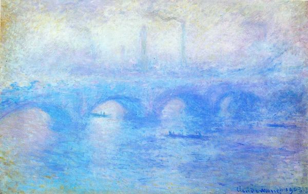 This is Claude Monet’s Waterloo Bridge, Overcast Weather, painted around the turn of the 20th century with oil on canvas. Look at how the pink sky fights for space with the heavy blue bridge, Monet’s mark-making here feels so instinctive, so process-driven. It's funny, you know, the way Monet builds up the surface with all these little strokes and jabs of color. There’s a real materiality to it - like he’s wrestling the paint into submission. Take a look at the lower portion of the bridge, there are dabs of pink that disrupt the blue, the thick application of paint almost feels like an act of defiance, or an attempt to create the feeling of constant change. Monet was always chasing the light, trying to catch these fleeting moments. You see something of that searching quality in the late work of Turner, who was also interested in how light could dissolve form. These paintings aren’t about the finished product, but about the messy, beautiful struggle to capture something that’s always slipping away.