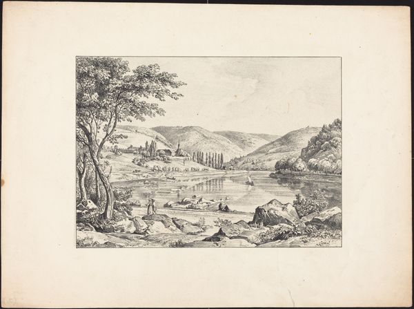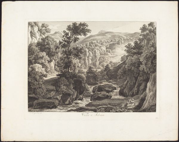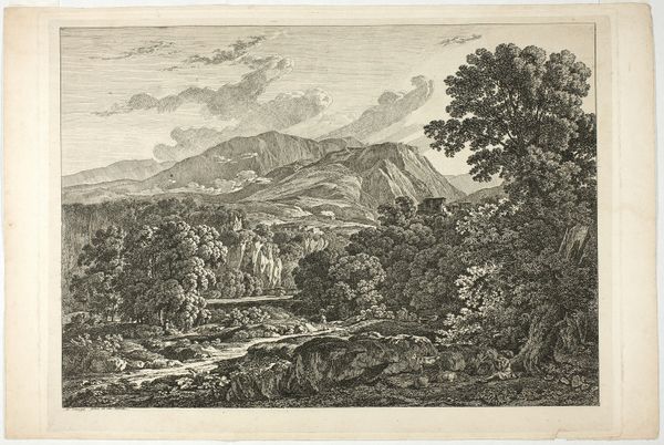 Curator: Johann Christian Reinhart's 1792 print, "Pallazzola," renders a Neoclassical Italian landscape through etching and ink. The work presents an idyllic vista, doesn't it? Editor: It does have that romantic grandeur. I’m immediately struck by its stillness; a tranquil sort of silence pervades the scene despite all the detail. The composition directs our gaze skillfully—the mountains in the background to the towering tree on the right, it really invites reflection. Curator: Definitely. Consider Neoclassicism and its resurgence of interest in antiquity; landscape prints like these functioned within a broader circuit, catering to elite European interests in experiencing and documenting classical heritage. Prints made sites like Pallazzola accessible. The imagined journey. Editor: I see your point about access. Did such picturesque depictions actually cater to and solidify existing power structures, perhaps influencing the traveler's gaze? The idealised version, filtered and presented… Were lived experiences on site something else entirely, and what's excluded by its portrayal as a landscape alone? Curator: That’s the tension at play, always isn’t it? Reinhart’s decision to represent the rural scene could be examined within an environmental framework, a conversation about land use, who it benefits and excludes. It beckons a critical conversation around the role of visual culture. Editor: These kinds of images became really powerful tools. It makes you wonder what political messaging was embedded within even these seemingly innocent landscapes. Who really was this paradise for? Curator: Absolutely, images never exist in a vacuum, do they? "Pallazzola," while beautiful on the surface, reveals how art both reflects and shapes its historical moment. It is a layered piece with lasting impacts on how landscape is represented, perceived, and potentially exploited. Editor: Exactly. Thanks for offering a different framework, It really does prompt some re-evaluation of such historical vistas!