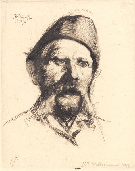 Editor: This is Louis Eysen’s "Portrait of cousin Hils," dating from around 1883. It's a pencil drawing with chalk and graphite. I’m struck by how the rough strokes manage to convey such a strong sense of character. What draws your eye when you look at it? Curator: The linear quality is paramount here. Consider how Eysen uses hatching and cross-hatching, the deliberate layering of lines, to construct form and volume. Observe especially around the eyes and beard – it isn't about smooth gradients, but a system of marks building toward darker values. How does this linearity contribute to your initial sense of 'character'? Editor: I think it’s in the detail, the small marks around the eyes especially, and the way the beard is constructed, it makes it feel textured and alive. Does the hat contribute in a significant way? Curator: Indeed. Notice the difference in how Eysen renders the hat versus the face. The hat lacks that intense network of lines, creating a flatter, more symbolic representation. The texture differentiates, suggesting different materials, yet it also focuses our attention keenly on the face – the site of expression and individuality within the composition. Do you see a clear focal point based on these visual cues? Editor: Yes, definitely the eyes now that you mention it. All those little lines really pull you in. Curator: Precisely. The concentration of detail around the eyes serves as the visual anchor, and directs our interpretation. I find this highlights a tension: between the reality of form created using a constructed linear vocabulary, and the emotive expression in the gaze. A testament to drawing! Editor: This examination of the lines is a reminder that there is more to the portrait than just the subject it depicts! Curator: Exactly! Seeing how the elements interact has enriched my viewing experience. I appreciate your insight and perceptive questioning today!