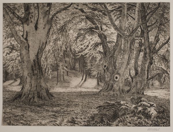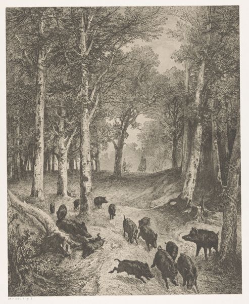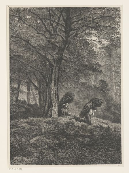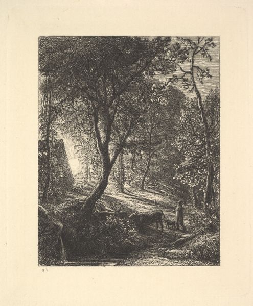 Editor: So this is "Chemin des Roches," an etching by Adolphe Appian. It feels so grounded, earthy. All those lines really bring out the weight of the cart, and of daily labor. What do you see in this piece? Curator: Well, it immediately situates itself within the Realist movement, right? This isn’t some idealized pastoral scene; it's a direct observation of rural life. The lack of idealization forces us to confront the lived experiences of the working class, and in particular their relationship to the land and its resources. How do you think the print medium impacts the message here? Editor: I guess being a print makes it reproducible, accessible... less elite? Curator: Precisely! Etchings democratized art in a way, challenging the exclusive grip of the salons and wealthy patrons. Appian, like many Realists, uses this accessibility to amplify the stories of those often unseen and unheard. Who do you think this artwork challenges? Editor: I suppose it's challenging the idea that only grand historical paintings or portraits are worthy subjects. This focuses on the everyday life of working-class people. It demands attention. Curator: Exactly. The figures aren’t heroicized; they’re simply present, enduring. Appian subtly asks us to consider their social and economic realities. How does the path itself speak to the viewer? Editor: It’s rocky, uneven... it doesn't seem easy. Like the lives of those people? Curator: In many ways, it symbolizes the struggles faced by those tied to the land. This wasn’t just about portraying a landscape, but critiquing the social structures that shaped the lives within it. Hopefully you start to see the connections to activism? Editor: Yes! Now that you've explained all this, I notice how this image seems so subtle yet holds so much power. It shows a side of society that was often ignored at the time. Thanks for your insight. Curator: And thank you for engaging with this important perspective on the artwork. It allows us to unpack the political statements that echo through its lines.
