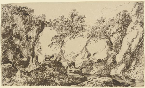 Franz Kobell’s ink drawing presents a landscape where rugged nature meets the subtle hints of civilization. The composition is dominated by towering, fractured rocks on the left, balanced by a delicate tree on the right, creating a visual tension between the untamed and the cultivated. Kobell's use of line is striking. Dense, parallel hatching defines the rocks, emphasizing their mass and texture. In contrast, the tree is rendered with finer, more delicate lines, giving it an airy quality. The path, implied through fluid strokes, guides the eye toward a distant city, suggesting a narrative of journey and discovery. This interplay between the rough and the refined, the immediate and the distant, engages with Enlightenment ideals of taming nature through reason. Yet, Kobell's emphasis on the sublime power of the natural world also hints at a Romantic sensibility. Ultimately, the drawing invites us to consider how we reconcile our place within nature.