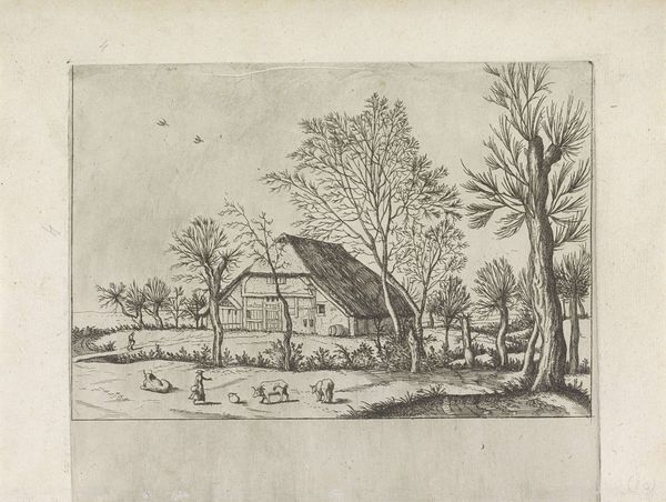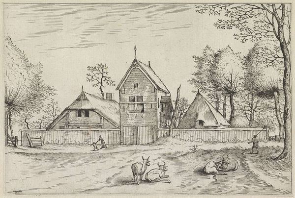 Curator: Let's turn our attention to "Farmhouses along a Cornfield," an etching attributed to Johannes or Lucas van Doetechum, made before 1633. You can find it here at the Rijksmuseum. Editor: It has a humble simplicity, doesn't it? The thatched roofs and unpretentious landscape are charming in their plainness. And yet, even through the etching technique, it offers some sense of mass and depth. Curator: The prevalence of such scenes speaks volumes about the era. Genre paintings like these captured the essence of everyday life, glorifying the simple existence of rural communities. Note how even birds in the sky feel connected to the toil. Editor: What’s striking is the reliance on etched lines to simulate the tactile quality of a rural environment. This emphasis reveals an interest in depicting labour; you can see individuals busy along the lane, implying production and an emphasis on local existence, especially if one focuses on the medium being an etching which permits for circulation to others, emphasizing and valuing the domestic landscape. Curator: Precisely! The arrangement isn't haphazard; it echoes a sense of order and piety. This evokes archetypal stability and harkens back to older landscape traditions found elsewhere in the Renaissance tradition. One also detects themes associated with a golden age, where genre painting serves as reminder to connect and venerate folk ways, but filtered through a nostalgic, and constructed image of tradition. Editor: Constructed how? Consider that to make this accessible, the artist etched copper. It's an industrialized print removed from lived-experience – for easy consumption in the market place! The very materiality reminds us of its departure from being a simple, honest depiction of farm life. It has been mass-produced. Curator: Interesting. So the imagery then becomes doubly compelling: we see these images as tokens to the past as much as contemporary artifacts in and of themselves. The symbols thus are wrapped into a physical history too. Editor: It's an excellent way to read such imagery. Curator: Thank you; I think seeing that negotiation enriches my understanding considerably.