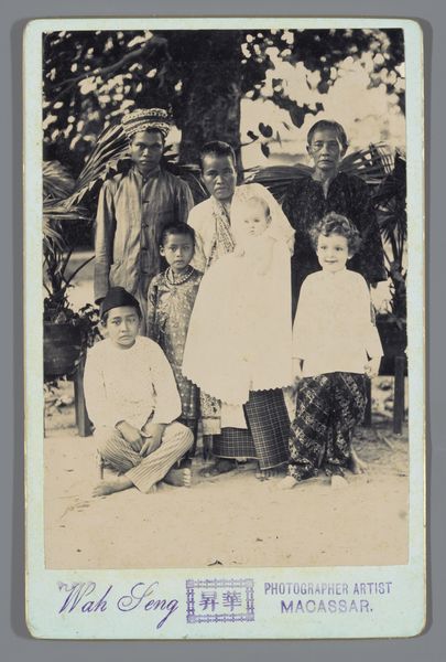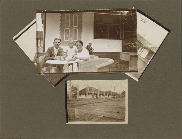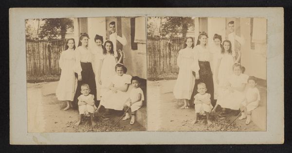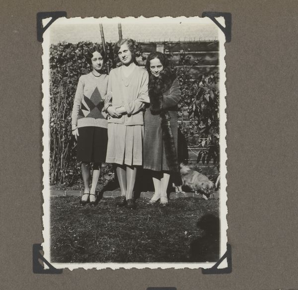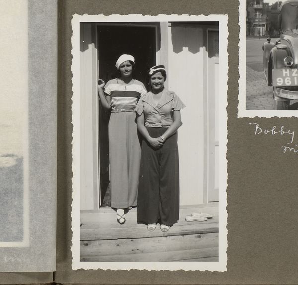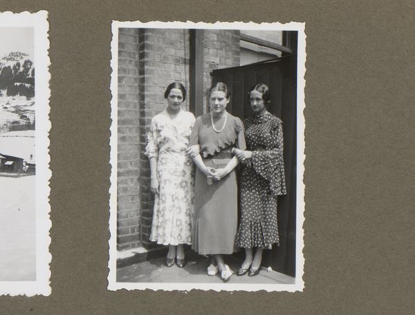 This tiny photograph captures Wilhelmina van Zijll de Jong, Dootje van Zijll de Jong, Tootje Wassink, Meinard Dorus Mijer, Catherine Gertrude van Delden, and Henriëtte Wassink, and it’s made with light and silver. The process here is less about crafting an image and more about capturing a moment, a slice of life. It’s like the artist is saying, "Here we are, in this instant, with all our quirks and imperfections." The light makes this a study in grey tones. The women in the picture wear floral patterns, yet their shapes are vague and hard to make out. Look how the lace curtain on the right gently contrasts with the window frame: its gentle curve softens the square geometry of the doorway. It looks like a painting by Gerhard Richter, a blurry photograph smudged into something soft and melancholic. We don't know who made this, but its ambiguity invites an emotional response. It’s like a half-remembered dream, an echo from the past.