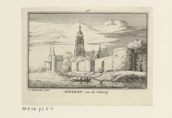 Curator: Ah, this little engraving is captivating. We’re looking at Abraham Rademaker’s “View of the Church at Scheveningen, 1630,” although it was created between 1727 and 1733. Isn’t it interesting how a landscape, so serene on the surface, can hold so much history? Editor: Serene is one word for it, I guess. I’m getting more of a “windswept, lonely outpost” vibe, actually. It’s all greys and stark lines. The church is massive against this turbulent sky…makes you wonder what the community endured, huddling around it. Curator: Exactly! That imposing presence is key. Churches, throughout history, represent stability, refuge. And in this Baroque piece, the dramatic sky, typical of the period, doesn't diminish that symbolic weight; it emphasizes the church’s unwavering presence. The Golden Age was all about moralizing landscapes. Editor: Maybe, but I find myself drawn more to the tiny figures with their cart, barely noticeable. It’s their story I want to know – what's their relationship to this behemoth structure looming over them? They appear to have walked a path before them, with ruts and markings in the foreground. Curator: They offer a human scale, I think. And that cart? Transportation, trade... the lifeblood of the community flowing beneath the church’s gaze. Think of the symbolism—earthly matters existing alongside spiritual guidance. Editor: I’m still caught on that steeple. It's almost needle-like, pointing aggressively towards the heavens, as if it's piercing through the angst ridden sky. But the building and it's mass seem protective rather than imposing, when imagining what its residents seek for. Curator: Perhaps a little of both. This piece holds within its small frame an interplay of security and aspiration that goes beyond its scale. That visual complexity, in the end, it's precisely what makes it endure, I feel. Editor: Yes, an entire history captured in what looks like a fleeting glance.