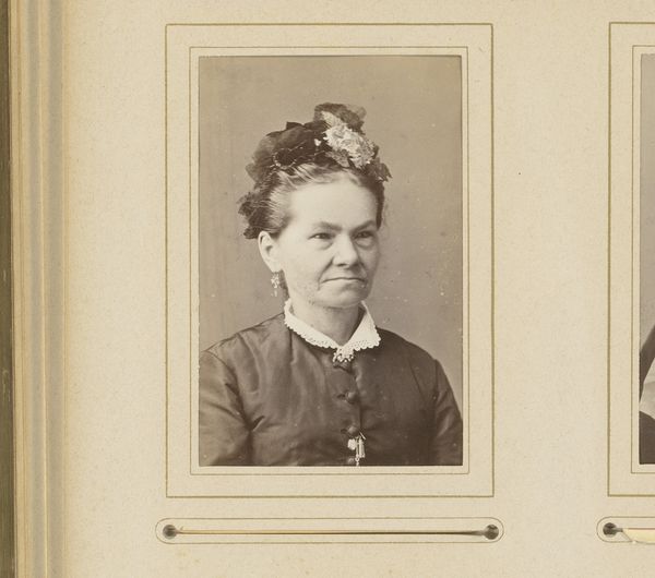 Curator: Looking at this albumen print, titled "Portret van een onbekende jonge vrouw," by Jean Baptiste Joseph Graveleau, I can't help but wonder about her story. It’s thought to be made sometime between 1872 and 1885. Editor: There's a quiet melancholy about her, isn’t there? The way she's positioned, hands gently clasped, suggests a moment of reflection. It feels almost like she’s aware of being watched, and she’s guarding a secret. Curator: Or perhaps embodying the very restrictions placed on women during that era. Note the formality of her dark dress, the tightly bound hair. Everything speaks to the constrained social expectations. Who was she really, beneath those layers? I see the studio mark from Rennes—a provincial photographer capturing local lives, possibly aspiring gentry. Editor: Do you think photography allowed women a rare form of self-representation then? A space to control their image, albeit within societal boundaries? There’s a palpable tension between vulnerability and self-possession in her gaze. And even agency—look, a hint of a bracelet peeking out. Curator: I find her serenity intriguing. A challenge, perhaps? Almost like she knows she’s on display but holds back her true feelings. I keep returning to the single white flower in her hands—a prop, but what does it mean? Hope? Mourning? Editor: I tend to see objects as silent disruptors of any cohesive interpretation; the flower might symbolize nascent feminism of the late 19th century. We are watching an active agent—though unnamed—in the theater of gender, class and visibility. It is her individual story, yes, but within a cultural framework. Curator: Exactly. Though unnamed, and the photograph is faded with time, she still speaks, inviting us to question. Maybe that is all we need to recognize: these glimpses from lives unknown to us that linger to this day, echoing through time. Editor: I agree, and the "genre-painting" feel only heightens the artifice. It invites us to resist passive viewing. So, while Graveleau captured her image, it’s our responsibility now to keep unraveling it.