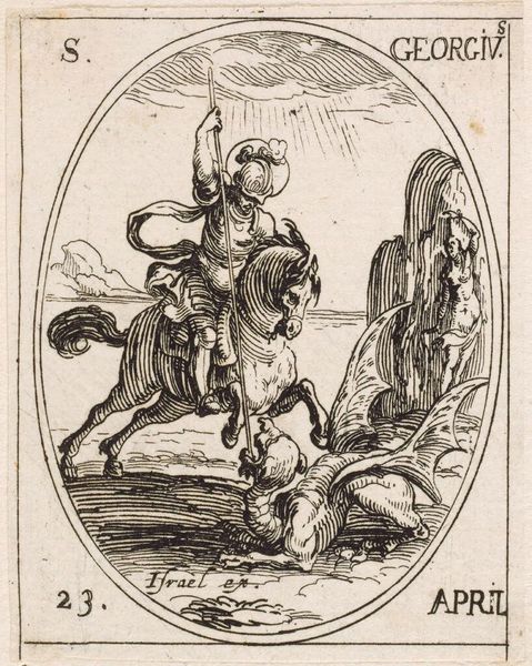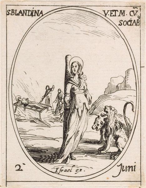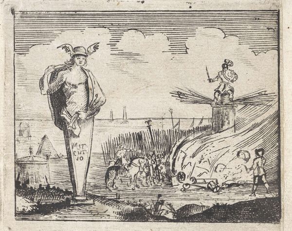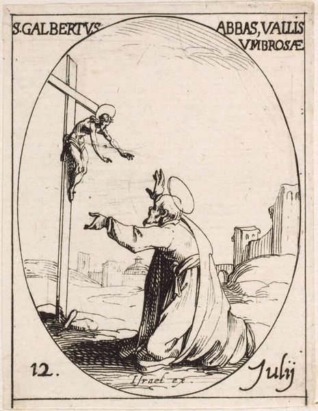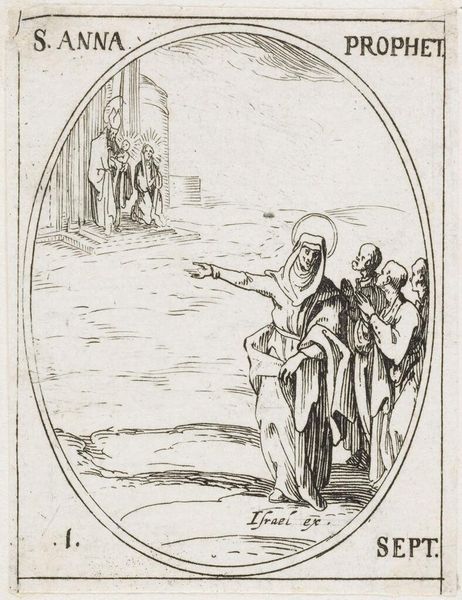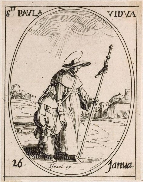 Curator: This print, titled "Saint Meliton and His Companions", comes to us from Jacques Callot, who lived from 1592 to 1635. Editor: It has such a somber atmosphere, despite the miniature scale, the figures seem burdened and weary. Curator: Indeed. The etching technique, with its precise lines, creates a fascinating interplay of light and shadow. Notice how Callot uses hatching to define form and space. Editor: The figures being carried certainly convey vulnerability; this image is rich in Christian symbolism, suggesting themes of martyrdom, faith, and salvation. Curator: An astute observation. The composition, with its receding landscape, emphasizes the arduous journey of these figures. It is an examination of form and the human condition. Editor: Its impact is undeniable. Seeing such symbolic weight in such a small format, it leaves a lasting impression. Curator: Absolutely, it's a masterful encapsulation of faith and artistry.