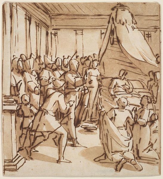 Editor: So, here we have "Procession of Figures," an ink drawing, likely from the 18th or 19th century, currently residing at The Art Institute of Chicago, and attributed to Masaccio. It feels almost dreamlike, the figures fading into the toned paper. What catches your eye about it? Curator: Oh, this is intriguing! First off, forget the strict attribution. "Attributed to" often means "we haven't a clue, but it’s in the style of". Instead, I want you to really *look*. The figures *are* dreamlike, aren’t they? Like a half-remembered procession glimpsed through a veil. It makes me think about echoes of the past. Editor: Echoes in what sense? Curator: In the sense that we’re looking at a study of figures that have perhaps been studied before, copied over, or dreamed of. The drawing looks both hesitant and confident, wouldn’t you agree? There's an immediate capturing of form, but without that obsession for perfect classical articulation. It’s searching rather than stating. And, I think I love it for precisely that reason. What do you make of their robes? Editor: They give them an almost monastic or spiritual air, don’t they? Is that intentional? Curator: Maybe, but maybe not! That’s where it gets fun, eh? Their robes certainly point towards ritual and perhaps religious orders, but without a setting we can never be sure. What matters to *me* is how the robes provide that amazing contrast to those bare feet...grounding these lofty figures into something deeply human. The paper looks stained with water and use… doesn't that also speak volumes? Editor: It does. This reminds me that a work’s story isn't always about grand statements, it’s also in the imperfections and the search. Thanks! Curator: Indeed. And remember art is ultimately felt, it connects with your humanity and experiences first. It can also get muddled, though, so trust yourself but never believe a word *I* say either, ok?