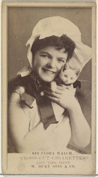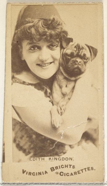 This is a sepia-toned promotional card from the Kinney Brothers Tobacco Company’s Actresses series. Immediately, one notices a carefully composed scene, dominated by soft lines and gentle gradations of tone which evoke a sentimental, almost dreamlike quality. The composition is structured around the gentle curve of Theresa Vaughn's arm, cradling a small cat. The soft hat frames her face, drawing our eye to the smile playing across her lips. This intimate gesture, combined with the actress's gaze, creates a sense of closeness. Consider the semiotic implications here; in the 19th century, actresses were figures of public fascination and desire, and to depict one holding a domestic animal would have created new layers of meaning. This is no longer simply a portrait but also a carefully constructed narrative playing with notions of beauty, virtue, and celebrity. Note how the muted palette, typical of early photography, further enhances the card's romantic mood. Through the use of tone and the interplay of light, shadow and composition, the company's card performs an act of subtle yet persuasive messaging.