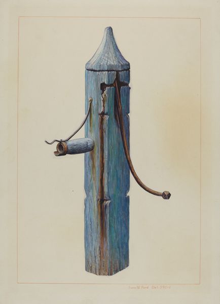 Curator: This drawing, “Spiral Hay Fork,” was rendered in watercolor by Oscar Bluhme around 1941. Editor: It's striking! Stark, almost lonely, yet incredibly precise. The color palette is quite muted. Curator: Bluhme's works, often categorized under modernism and realism, explored the intersection between agricultural landscapes and human intervention. Looking at the depicted hay fork in its formal qualities, and knowing that it depicts a common tool in a certain moment, it could tell us a lot about social and working life in 1940's America. Editor: Absolutely, that's intriguing. It could reflect rural identities and the economic disparities in those areas at the time, since technologies like this impact people's working day. Are we seeing farm machinery presented as art, inviting us to contemplate the labor it represents and its relationship to the individuals using the it? Curator: Precisely! And think of how he uses watercolor to convey the material essence of the metallic implement – its texture, its potential for rust. Notice how, in comparison, the farmer, hay stack and tools behind it appear minuscule in comparison. Editor: It certainly appears imposing. It begs the question of agency. Are humans commanding tools, or the other way around? The single drawing suggests isolation; are we missing, in other words, a sense of collective labor, social connections, or support? Curator: It also compels me to question its purpose beyond sheer artistic endeavor, potentially alluding to the profound changes occurring in agricultural practices during that era. How technology reshapes how individuals engaged with the world. Editor: And I find myself drawn to the implications surrounding the representation of rurality in the face of modernity. What did it mean to portray agricultural tools amidst industrial expansion and social transformations? It would be fascinating to consider how contemporary audiences interpret that image as a mirror to today's anxieties surrounding technology, labor, and power dynamics. Curator: It does leave me pondering whether we romanticize tools like these – we’ve become detached from the tactile labor it suggests. Bluhme's artwork offers us space to really think about those historical transitions. Editor: I completely agree.