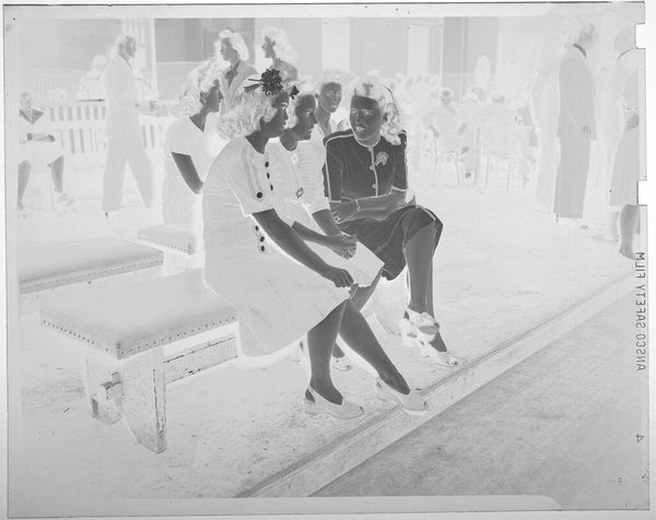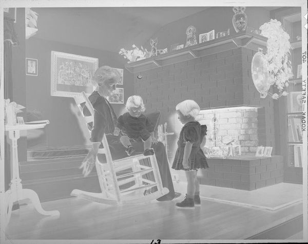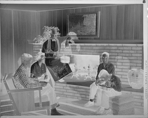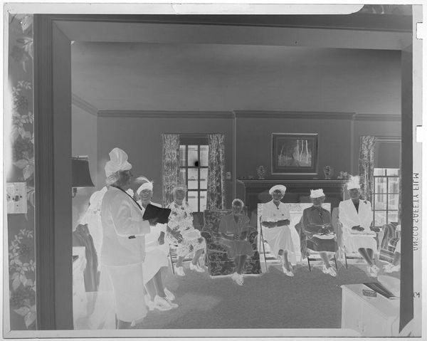 Editor: Here we have "Untitled (family on couch by window)," a black and white photograph by Lucian and Mary Brown. It's quite small, and the inversion of tones gives it an eerie feel. What strikes you about this photograph? Curator: The photographic process itself is key here. We see the raw material of film, manipulated to capture a staged domestic scene. The labor involved, from setting the shot to developing the negative, speaks to a specific social practice of family portraiture and its consumption. Editor: So, you are focusing on the making and the context rather than, say, the family dynamic portrayed? Curator: Precisely. The image becomes an artifact, revealing the means of production and the social rituals tied to photographic technology. It makes me wonder about the family's access to, and engagement with, this technology. Editor: I hadn't considered that angle; it’s fascinating to think about it as a product of labor and technology. Curator: Exactly! It shifts our perspective from the sentimental to the material.