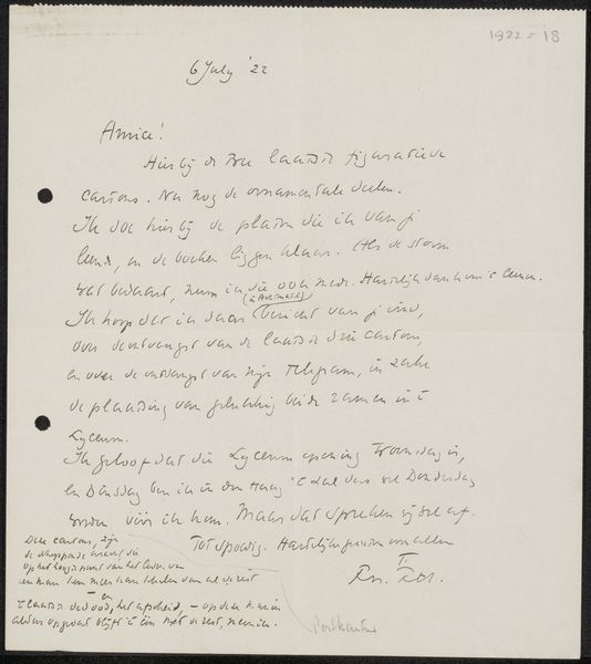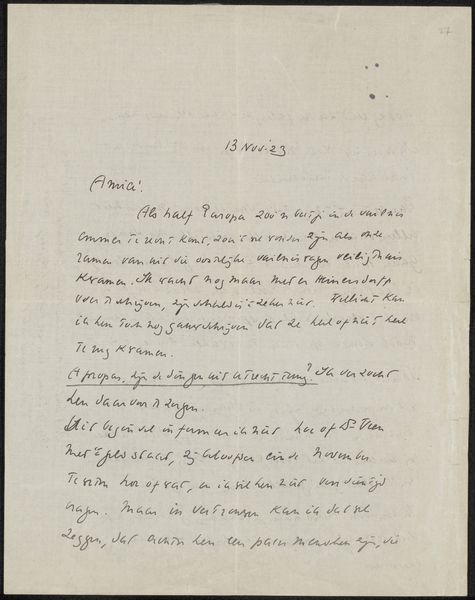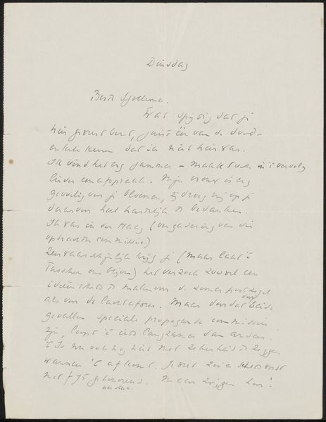Editor: Here we have "Brief aan Willem Bogtman," a drawing by Richard Nicolaüs Roland Holst, dating somewhere between 1892 and 1938. It’s ink on paper, and currently residing at the Rijksmuseum. My first impression is of something intensely private. It’s a handwritten letter, densely packed onto the page, hinting at urgency. Curator: Indeed, the overall composition strikes me as less concerned with formal aesthetics and more focused on the raw expression of thought. Observe the varying weight of the ink, the fluctuating line quality—at times assertive, at others, almost trembling. These aren’t flaws; they’re integral to the work's dynamism. Editor: I am drawn to how the act of handwriting imbues this piece with vulnerability. A typed message creates distance, but ink on paper feels direct and unedited. I wonder, what might a letter like this signify in that historical and cultural context? What intimacies might it contain? Curator: I am not really seeing vulnerability. Note the systematic, if rushed, ordering of the lines. The visual effect arises not from any symbolic weight of handwriting but simply the materiality of ink applied with varied pressure onto the receptive ground of the page, creating patterns of light and shadow. The letter then transcends its ostensible meaning becoming texture and shape, achieving art. Editor: You're right, of course; the play of light and shadow, the textural richness, adds an undeniable visual layer. But I can’t dismiss the human element. Letters, as symbols, are so emotionally laden, particularly personal correspondence. Aren't we always decoding hidden narratives in such artifacts? Curator: To be sure. While meaning emerges and is naturally ascribed through our subjective perception, to impose an external cultural or social reading onto the form distracts from its more fundamental formal characteristics. See the rhythm, for example. Editor: I see both perspectives here, the raw personal impulse enshrined with concrete shape and balance. Thank you for clarifying and complicating what seems like a simple, intimate letter. Curator: A fruitful discussion. It is in probing these relationships of form that our understanding is always deepened.