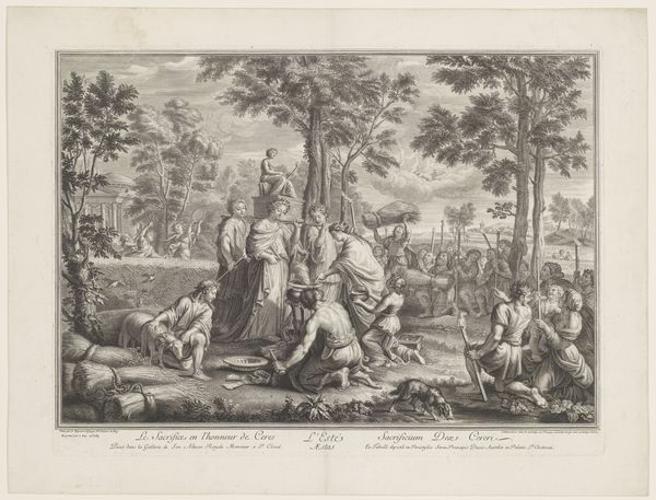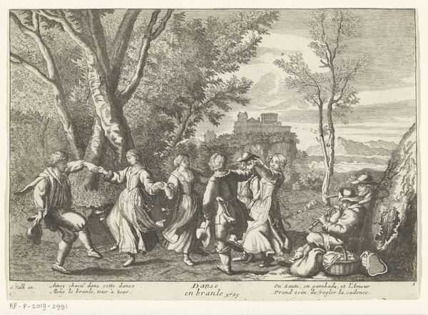 Editor: This print, entitled "Zomer," dating from the late 16th to mid-17th century, is by Nicolaes de Bruyn and is currently held in the Rijksmuseum. The whole scene has a striking formal quality—it almost looks like a stage production with such well-defined and carefully-placed characters in the composition. What visual elements jump out to you in this piece? Curator: The intricate linearity is quite compelling. Note how the artist uses varied densities of lines, cross-hatching, and stippling, to define form and texture in the print. Observe how the carefully articulated gestures and postures contribute to an overall impression of balanced rhythm. Have you observed the visual relationship among figures? Editor: The foreground figures certainly command attention with their activities: drinking, harvesting, and generally enjoying the end of a hard day. But even in the far background the artist included carefully crafted elements like farm equipment and meticulously shaped houses! Does the background inform our view of the primary elements? Curator: The formal arrangement within the pictorial space suggests a stratified reality; the receding landscape, while carefully rendered, exists as a backdrop emphasizing the activity in the foreground. The deliberate construction invites consideration of its various components—the interlocking network of lines in the figures against the more expansive but subdued background. Consider the contrasting textures of the thatch and wheat versus the smoother rendering of flesh and garments. What compositional techniques help to pull those aspects of the piece forward? Editor: I think the relatively sharp contrast in lines gives depth to figures and brings the subject into focus. Looking closer, it’s incredible how much detail is conveyed by line work alone. Thank you, I can really see and appreciate the value of formal qualities. Curator: And I'm impressed by your observations regarding the interplay of surface texture. A rewarding analytical pursuit, indeed.