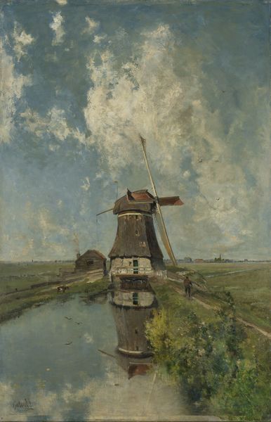 Curator: Soaked in atmosphere, isn't it? Like peering through a veil of soft gray rain. Editor: Indeed. What we're looking at is "Waterway near the Baarsjes, Amsterdam," an oil painting likely created between 1880 and 1901 by Jan Hillebrand Wijsmuller. Curator: Wijsmuller really captures the quiet industry of the Dutch waterways. The mills are these watchful, almost spectral figures in the distance. And those boats—do you feel a story there? Someone unloading goods, maybe thinking of home. Editor: There's a distinct emphasis on structure, though. See how the composition leads the eye? The pilings in the foreground establish a linear entry, directing our gaze towards the central water mass and then beyond, into the depth of the field with those repetitive verticals of the windmills and mast of ships. The horizontal emphasis in the low buildings balances this verticality. Curator: It's funny you mention the structure because when I look at it I think he must have just slapped that oil right on the canvas. The hazy atmosphere makes it dreamlike. Editor: Consider the subdued palette though. Browns and greens dominate. Yet within that, Wijsmuller coaxes out subtle tonal shifts, creating depth and an almost palpable sense of humidity. The muted palette harmonizes well with a limited dynamic range of values, resulting in a calming painting that, indeed, evokes the damp Dutch landscape. Curator: You’re right, it's a symphony of greys. What this brings to mind is the perpetual turning, those windmill blades… life always moving. The muted colours remind us of our inevitable return. That’s not too heavy, is it? Editor: Not at all. But, in closing, the visual organization is quite compelling and reveals Wijsmuller’s attention to the careful balance of elements and textures, where nothing feels extraneous or arbitrary. Curator: It's an emotional piece; a snippet of ordinary life made somehow extraordinary through art.