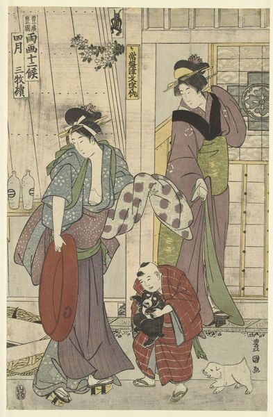 Curator: Today we're looking at a woodblock print titled "Kiyomizu, from the series 'Seven Komachi (Nana Komachi)'" by Chōbunsai Eishi, created around 1791 or 1792. Editor: My initial impression is one of serene beauty. The muted colors and delicate lines evoke a sense of tranquility. It’s remarkable how the artist captured light. Curator: The composition is quite interesting; Eishi masterfully employs perspective, drawing the eye toward the background. The artist is celebrated for idealizing female beauty through the subtle elegance of line. Observe the arrangement of these three figures and the wall behind them; note their geometry. Editor: I'm drawn to the textiles depicted. The layering of kimono fabrics, their varied patterns... they must have been time-consuming and meticulous to produce in both real life and on the woodblock. These garments hint at a sophisticated understanding of fashion and material production in this period. Curator: Absolutely. Ukiyo-e prints such as this often captured the contemporary life of Edo period Japan. Consider the cultural significance here—"Seven Komachi" refers to the legendary poet Komachi, depicted in seven different guises. Here, we observe these women associated with the Kiyomizu Temple. Editor: It's tempting to consider the labour involved. Who were the artisans carving these blocks, layering colors, and transferring the images? They are crucial figures in the production and circulation of images that so elegantly convey high culture. Curator: Indeed, though unsigned, such woodcuts called for highly trained artisans at different steps in the printing process, each contributing uniquely. If you note, Eishi focused less on actors or courtesans and more on educated women from the upper classes and elevated the category of bijinga, or images of beautiful women. Editor: Seeing those water currents juxtaposed against the patterned stonework underscores that tension between nature and culture central to Japanese art. It encourages me to see those two aspects not as conflicting, but integrated, even interwoven, as demonstrated in textile patterns that reflect similar organic forms. Curator: A very astute observation. This piece represents the quintessential elegance Eishi brought to Ukiyo-e prints—balancing refined composition, subdued yet evocative palette and graceful human form. Editor: Examining this piece makes one ponder the fusion of design, production, and representation; the delicate dance between artistic intention, the artisans’ hands, and social context. It underscores how art manifests from material and its social web.