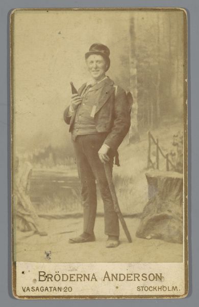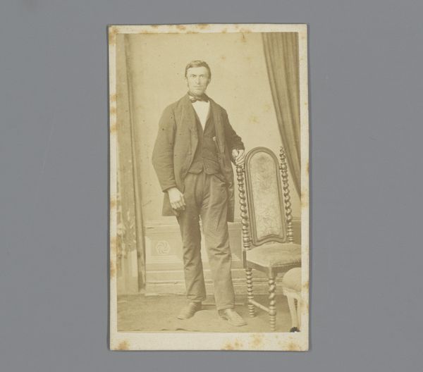 Editor: This daguerreotype, “Portrait of an Unknown Young Man by an Armchair,” dates to somewhere between 1868 and 1900 and is attributed to Hermanus Jodocus Weesing. The sepia tone gives it such a feeling of nostalgia. What strikes you most about this photograph? Curator: What immediately captures my attention is the pose itself. It is a studied performance of masculinity, typical of the era, but what about it feels subversive? I think about how this presentation of self can reinforce certain patriarchal ideals but can also be viewed through the lens of personal agency within societal constraints. Is he conforming or consciously challenging those norms through subtle gestures? Editor: That’s a fascinating perspective. I was focused on the fact that his identity is lost to us. Does the lack of identifying information change how we should interpret it? Curator: Absolutely. It prompts us to question the power dynamics inherent in portraiture, especially photographic portraits of this period. Who had the privilege of being documented? Whose stories are deemed worthy of preservation? This “unknown young man” could represent an entire segment of society often marginalized or overlooked in historical narratives. Editor: So, in a way, his anonymity becomes a statement itself? Curator: Precisely! It transforms the photograph from a simple portrait into a poignant commentary on representation, reminding us to be critical of whose faces and stories are amplified, and whose remain hidden. His image is thus powerful because his individual circumstances remain unknown. We can read into it and wonder. Editor: I never would have considered all of that on my own. It gives me a whole new way to consider portraiture! Curator: It’s about looking beyond the surface and asking questions about the broader socio-political context in which art is created and consumed. It is powerful to view how these notions still exist today.