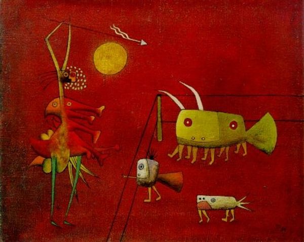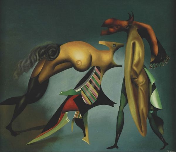 Editor: This is "La guerre africaine," or "The African War," painted by Jules Perahim in 1976 using acrylic paint. It definitely has a dreamlike quality, but also a slight feeling of tension with the sharp lines and weapon-like objects. What historical context informs this depiction of war, in your opinion? Curator: That feeling of tension is crucial. The 1970s were turbulent times globally, marked by Cold War anxieties and various post-colonial conflicts. Perahim, who experienced political persecution in Romania, may be channeling a broader critique of power and its impact. Notice how he abstracts the figures, almost dehumanizing them into geometric forms. Editor: So, you're saying the abstraction serves a purpose beyond aesthetics? Curator: Precisely. Consider the public role of art, particularly surrealism, in challenging political norms. Are these figures meant to represent specific parties, or are they stand-ins for broader concepts of aggressors and victims in an increasingly abstract form? Is Perahim engaging with or critiquing representations of African conflict in European art? What do you think? Editor: I didn't immediately think of colonial-era tropes, but seeing those strange, elongated bodies, I do wonder about a sort of alienation—from humanity or from place? Also how the bright colours highlight these more sinister aspects, I suppose it forces you to reckon with them more clearly. Curator: The colours indeed amplify the dreamlike, unsettling quality. Thinking about art's role, Perahim asks the viewer to consider power dynamics, challenging assumptions. Editor: I really see the narrative in a totally different light. Thank you for elaborating. Curator: It's fascinating how art can serve as a cultural mirror, and reveal the social context in new ways.