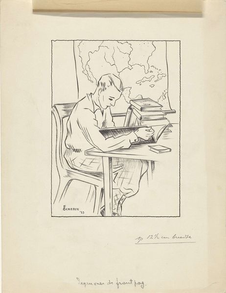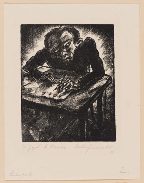 Curator: This is Max Beckmann’s “Man Reading II (Self-Portrait),” created in 1912 using graphite and lithography. Editor: Immediately, I’m struck by the weariness conveyed by the figure; there’s an undeniable air of melancholic introspection about the work. Curator: The lithographic process would have allowed Beckmann to create multiple impressions of this work, distributing it widely. What do you think this says about the self-portrait and its potential audience? Did he intend for the image of his own brooding to have broad appeal or be seen as more of an experimental exercise? Editor: It is interesting you mention that; one can view this portrait as an exploration of the modern intellectual burdened by the weight of knowledge and responsibility. Notice how the heavy, dark lines frame his face, almost as if trapping him within the confines of thought. Curator: I find myself focusing on the material reality of the artwork. Beckmann is quite obviously working here with what is at hand—a rather straightforward process of graphite on paper—yet, he manages to suggest something greater. How can simple media convey something that feels rather charged emotionally? Editor: Indeed. Beckmann often employed such chiaroscuro effects. Light emerges from a deep psychological darkness. Observe how the lamp serves as a potent symbol: while illuminating the book and mind of the subject, the dark contours and shadows suggest hidden emotional and philosophical struggles. It evokes the classic motif of inner conflict. Curator: Perhaps. For me, though, there is also a certain ordinariness here, with the artist rendering his domestic, creative space: the desk, the books, the lamp. It’s not exactly glamorous but relatable in its suggestion of interior labor. Editor: Certainly, an artwork laden with compelling details, isn’t it? Curator: I find myself leaving this brief look with more questions, which is what art, at its best, facilitates!