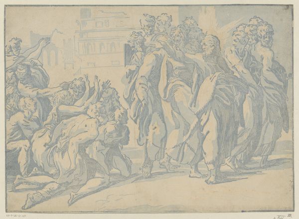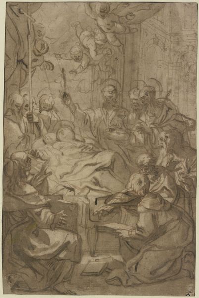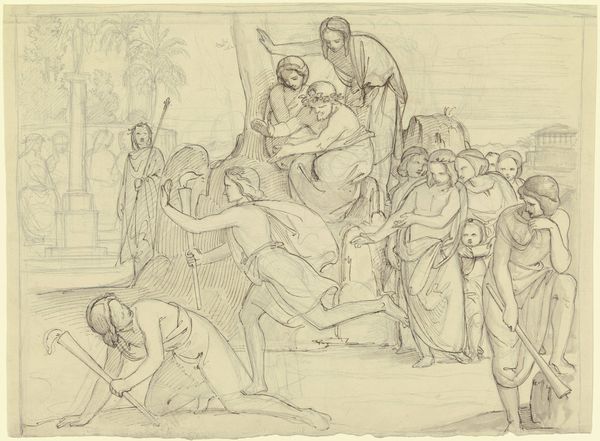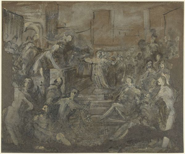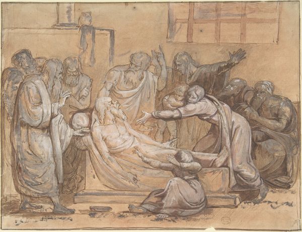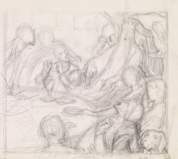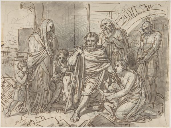 Editor: Here we have Frederic Leighton's ink drawing, "The Reconciliation of the Montagues and Capulets over the Dead Bodies of Romeo and Juliet," circa 1855. It has such a muted palette. What do you make of this work? Curator: I see a work deeply entrenched in the socio-economic realities of 19th-century artistic production. The choice of ink on paper, a relatively inexpensive medium compared to oil paint, suggests this might be a preparatory sketch. But it could also speak to the artist’s intention to create a more accessible, reproducible image for a wider audience, perhaps through prints. Consider how the materials themselves democratize the tragic narrative. Editor: That's interesting. So, you're saying the choice of ink impacts how it could be disseminated to the public? Curator: Exactly. Think about the labor involved. Was this created quickly for preliminary studies, or was there careful planning involved in mass production of illustrations and publications? That impacts the final product and how we should appreciate it. What can we tell of its production, the staging, and dissemination? The tragic theme gains further political weight as art is brought closer to common experience. Editor: I hadn’t considered how the materials themselves might connect to audience in that way. So, beyond just aesthetics, ink and paper became tools to address class? Curator: Precisely. And it begs the question, did this choice impact the perception or value of Leighton’s work within the broader art market of his time? Editor: That makes me consider Romanticism's association with wealthy patrons when, maybe, there were some looking for other audiences. Thanks! Curator: Indeed. I’ve now learned that the meaning resides, in part, in who gets access, in the materials, process, and distribution.